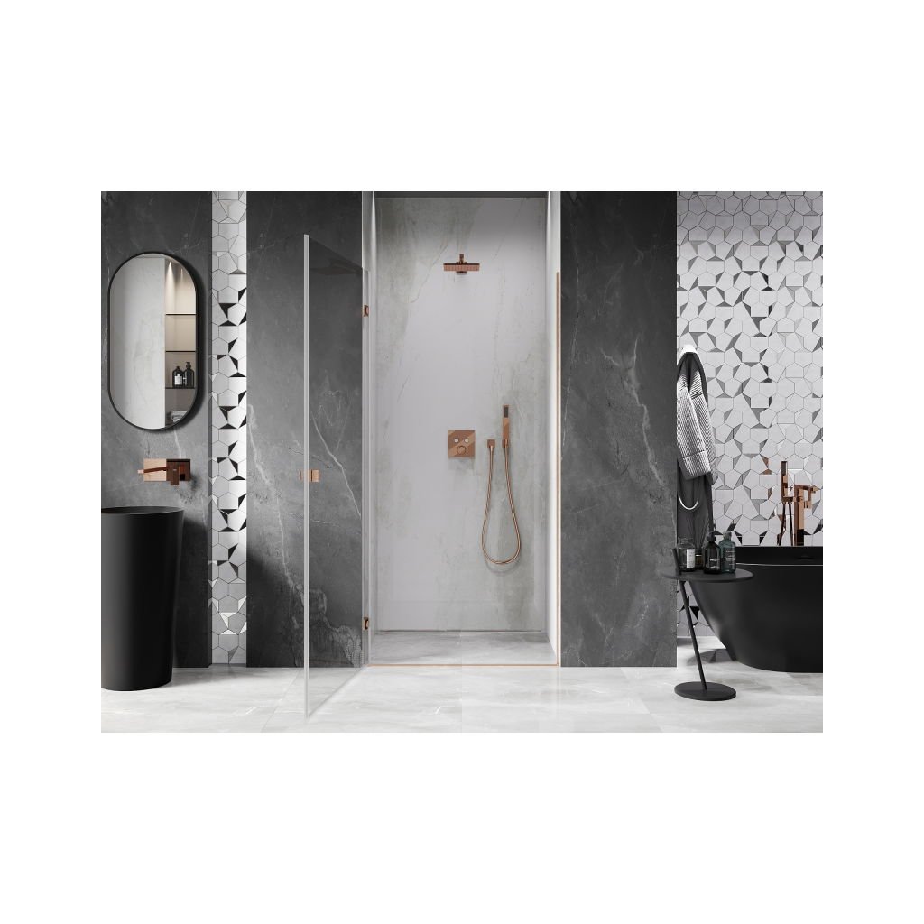 Több méretben kapható, stabil szerkezettel és csuklós ajtókkal rendelkezik. Az EasyClean felületű edzett üveg leegyszerűsíti a karbantartást, a szálcsiszolt réz profil pedig modern fürdőszobákba illik.