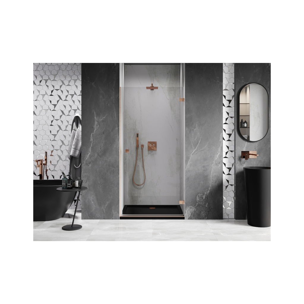 Több méretben kapható, stabil szerkezettel és csuklós ajtókkal rendelkezik. Az EasyClean felületű edzett üveg leegyszerűsíti a karbantartást, a szálcsiszolt réz profil pedig modern fürdőszobákba illik.