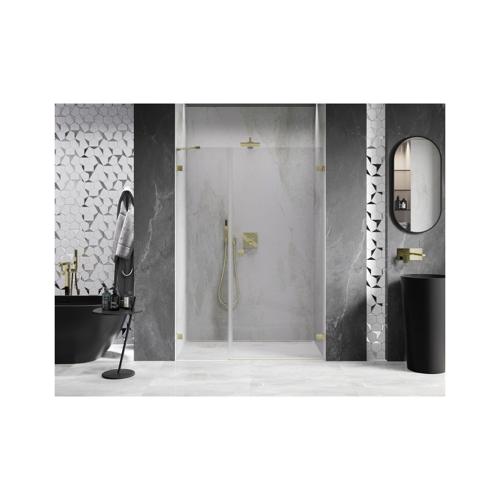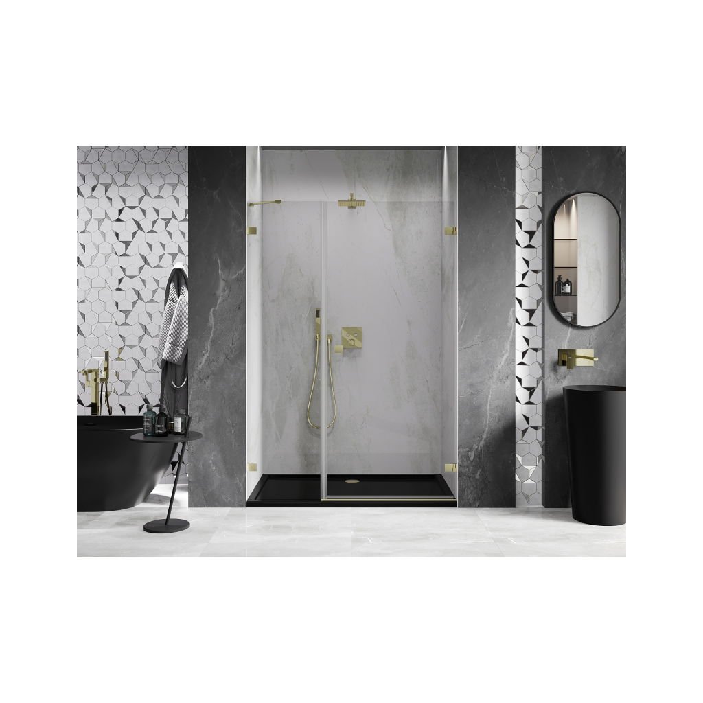 Több méretben kapható, stabil szerkezettel és csuklós ajtókkal rendelkezik. Az EasyClean felületű edzett üveg leegyszerűsíti a karbantartást, a szálcsiszolt arany profil pedig modern fürdőszobákba illik.