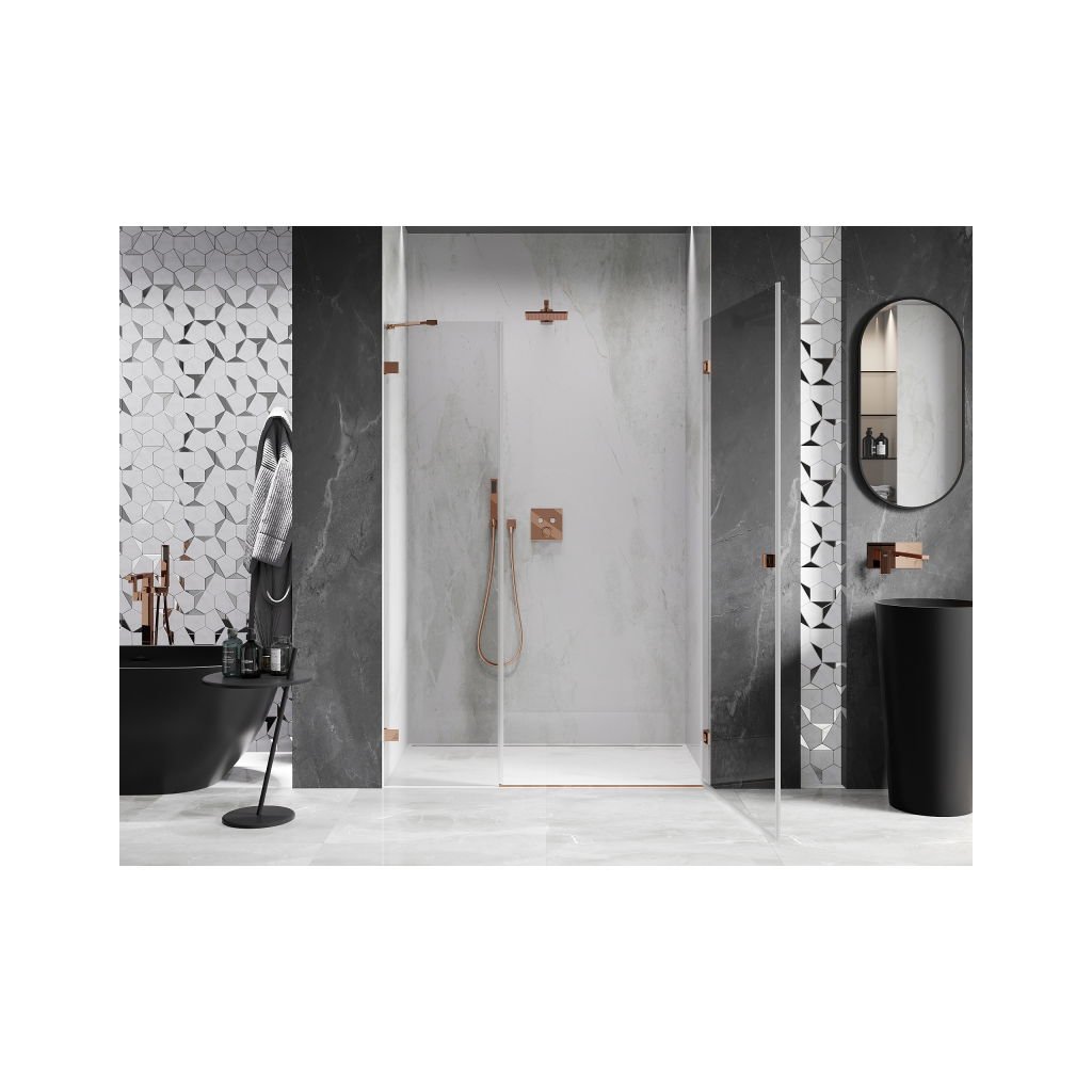 Több méretben kapható, stabil szerkezettel és csuklós ajtókkal rendelkezik. Az EasyClean felületű edzett üveg leegyszerűsíti a karbantartást, a rozéarany profil pedig modern fürdőszobákba illik.