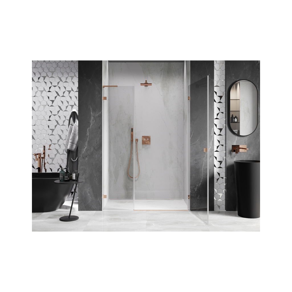 Több méretben kapható, stabil szerkezettel és csuklós ajtókkal rendelkezik. Az EasyClean felületű edzett üveg leegyszerűsíti a karbantartást, a szálcsiszolt réz profil pedig modern fürdőszobákba illik.