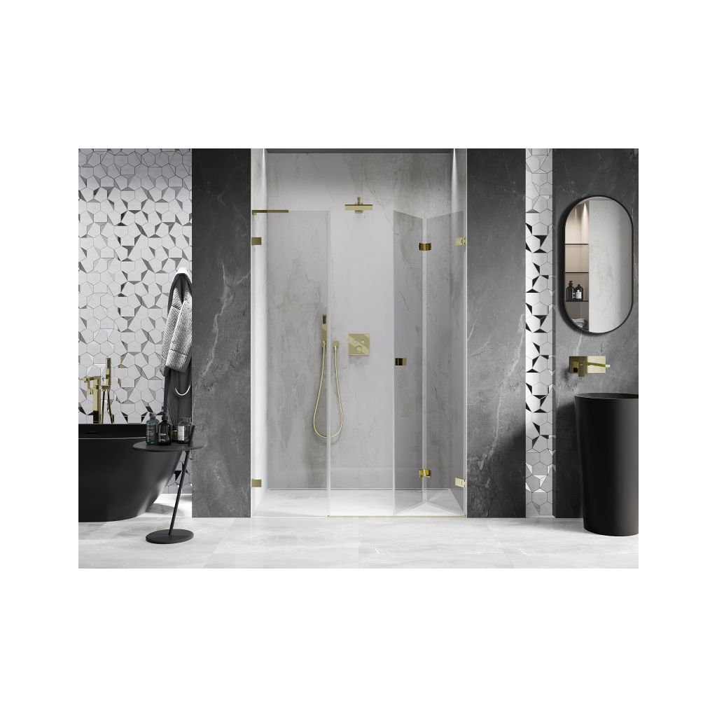 Több méretben kapható, stabil szerkezettel és harmonikaajtókkal rendelkezik. Az EasyClean felületű edzett üveg leegyszerűsíti a karbantartást, a fényes arany profil pedig modern fürdőszobákba illik.