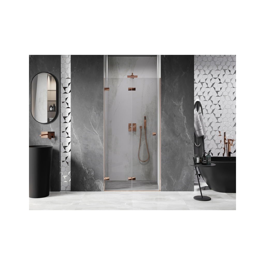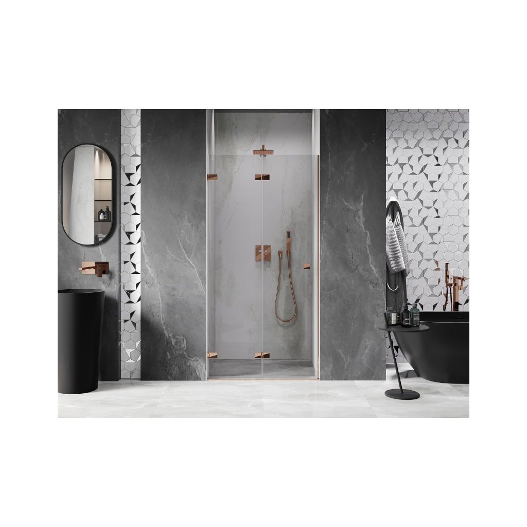 Több méretben kapható, stabil szerkezettel és harmonikaajtókkal rendelkezik. Az EasyClean felületű edzett üveg megkönnyíti a karbantartást, a rozéarany profil pedig illeszkedik a modern fürdőszobákba.