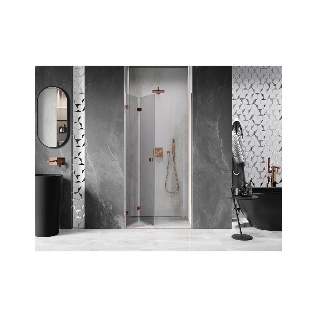 Több méretben kapható, stabil szerkezettel és harmonikaajtókkal rendelkezik. Az EasyClean felületű edzett üveg megkönnyíti a karbantartást, a rozéarany profil pedig illeszkedik a modern fürdőszobákba.