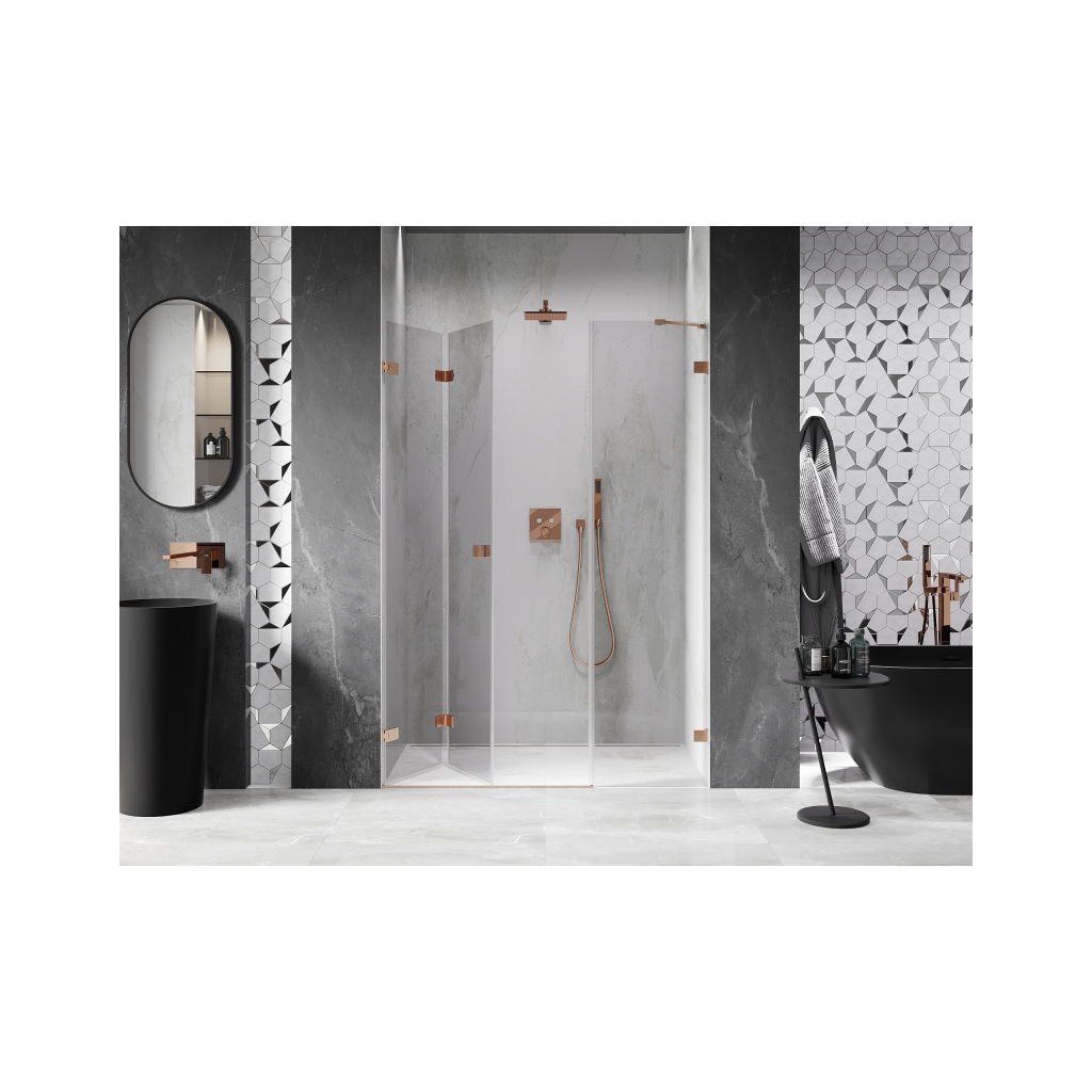 Több méretben kapható, stabil szerkezettel és harmonikaajtókkal rendelkezik. Az edzett üveg EasyClean felülettel megkönnyíti a karbantartást, a szálcsiszolt réz profil pedig modern fürdőszobákba illik.