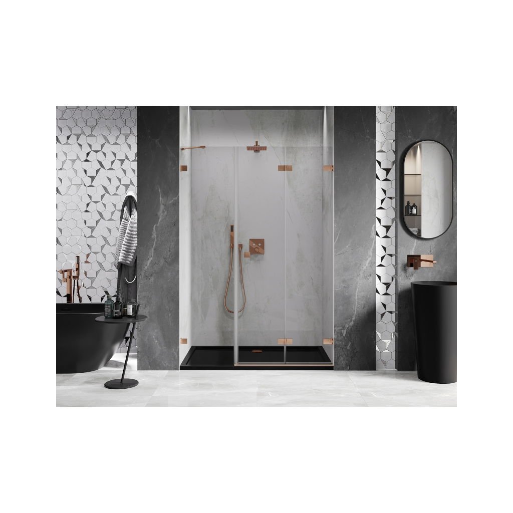 Több méretben kapható, stabil szerkezettel és harmonikaajtókkal rendelkezik. Az edzett üveg EasyClean felülettel megkönnyíti a karbantartást, a szálcsiszolt réz profil pedig modern fürdőszobákba illik.