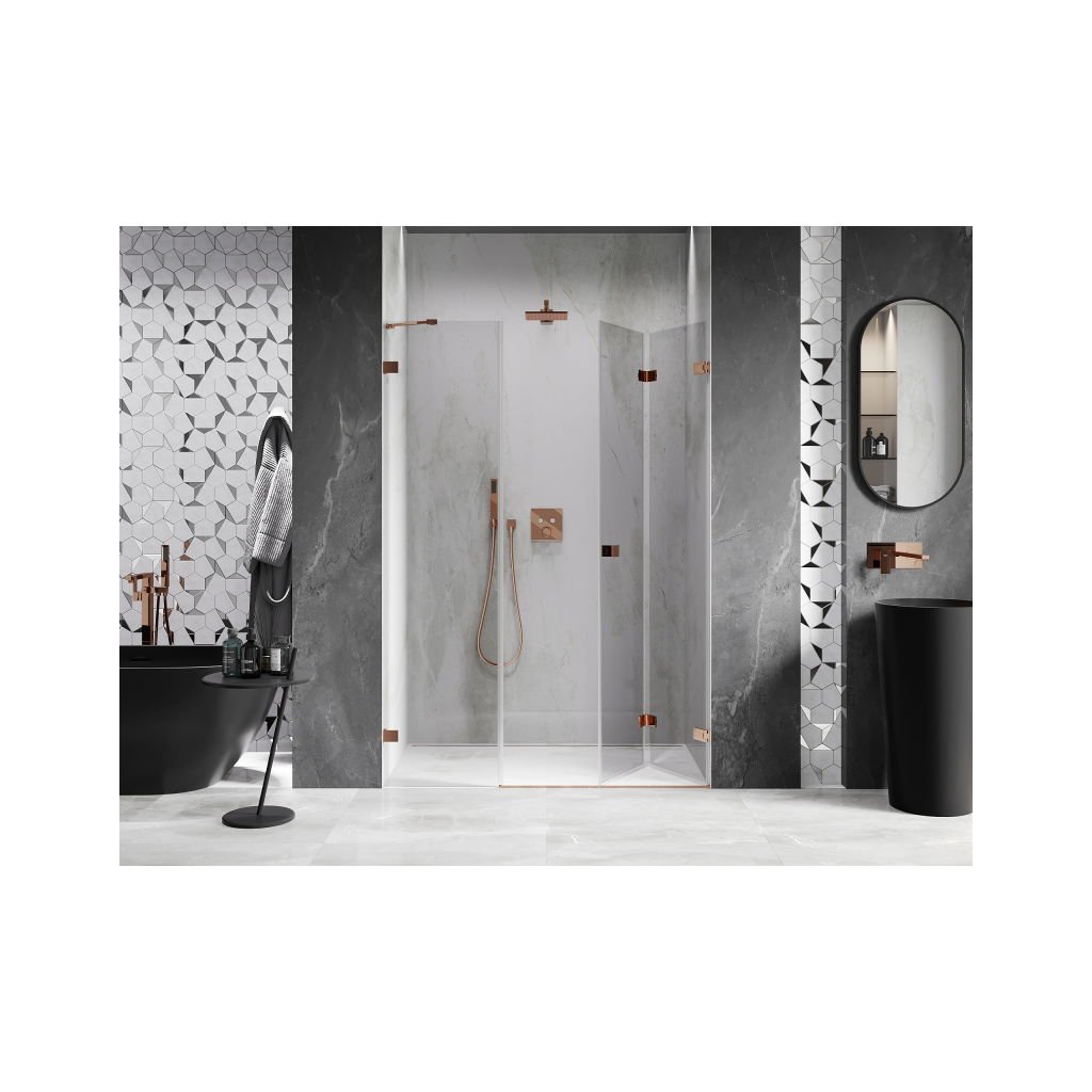Több méretben kapható, stabil szerkezettel és harmonikaajtókkal rendelkezik. Az EasyClean felületű edzett üveg megkönnyíti a karbantartást, a rozéarany profil pedig modern fürdőszobákba illik.