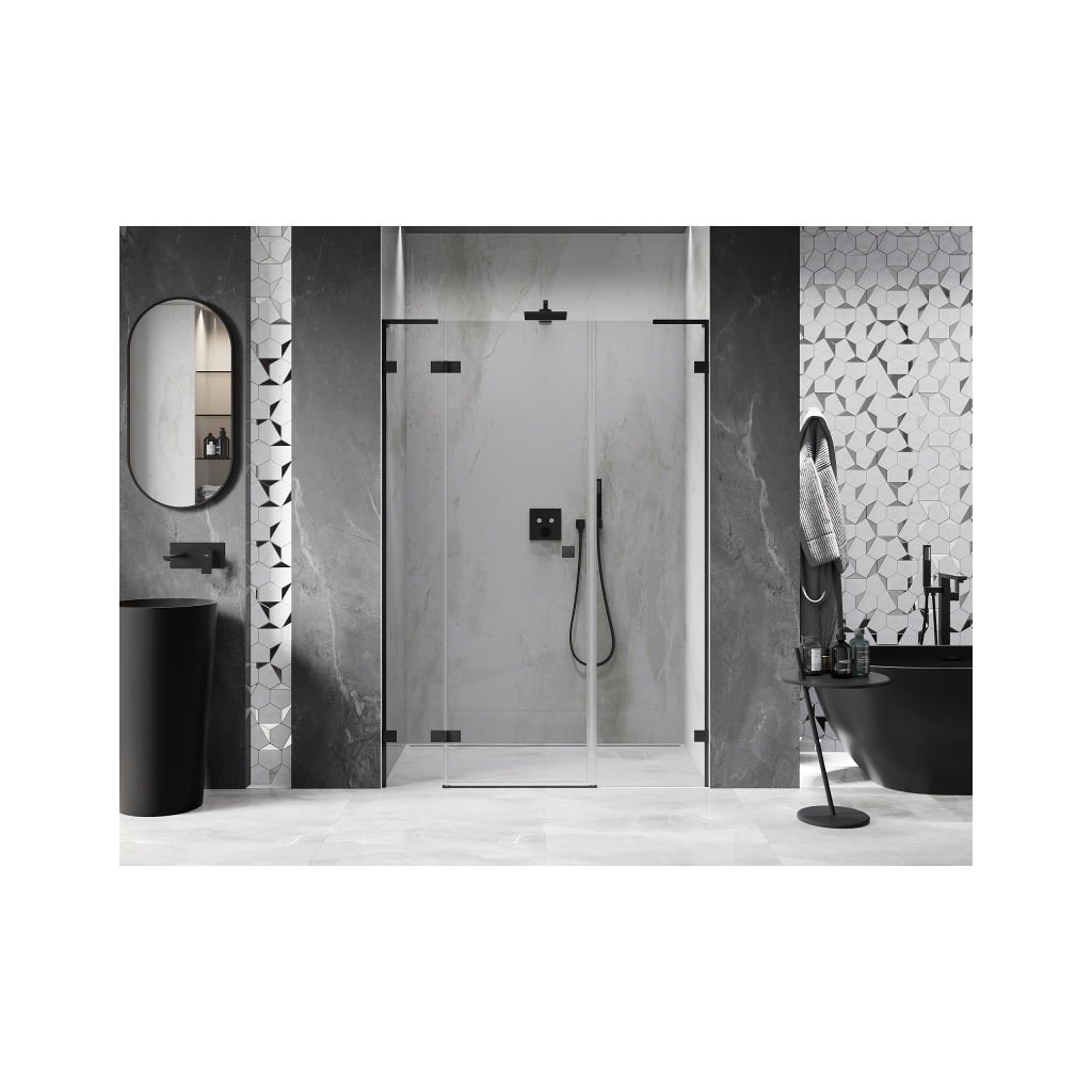Több méretben kapható, stabil szerkezettel és csuklós ajtókkal rendelkezik. Az EasyClean felületű edzett üveg leegyszerűsíti a karbantartást, a fekete profil pedig modern fürdőszobákba illik.