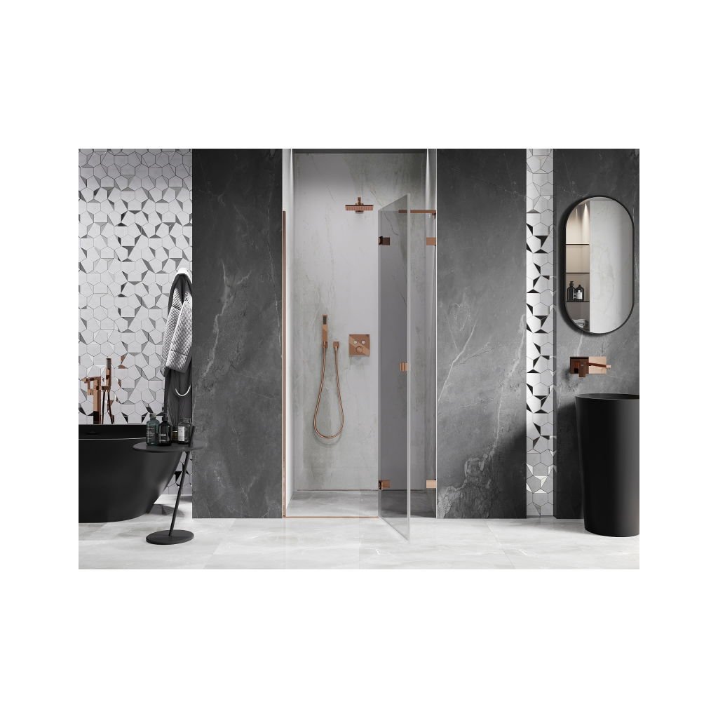 Több méretben kapható, stabil szerkezettel és csuklós ajtókkal rendelkezik. Az EasyClean felületű edzett üveg leegyszerűsíti a karbantartást, a rozéarany profil pedig modern fürdőszobákba illik.