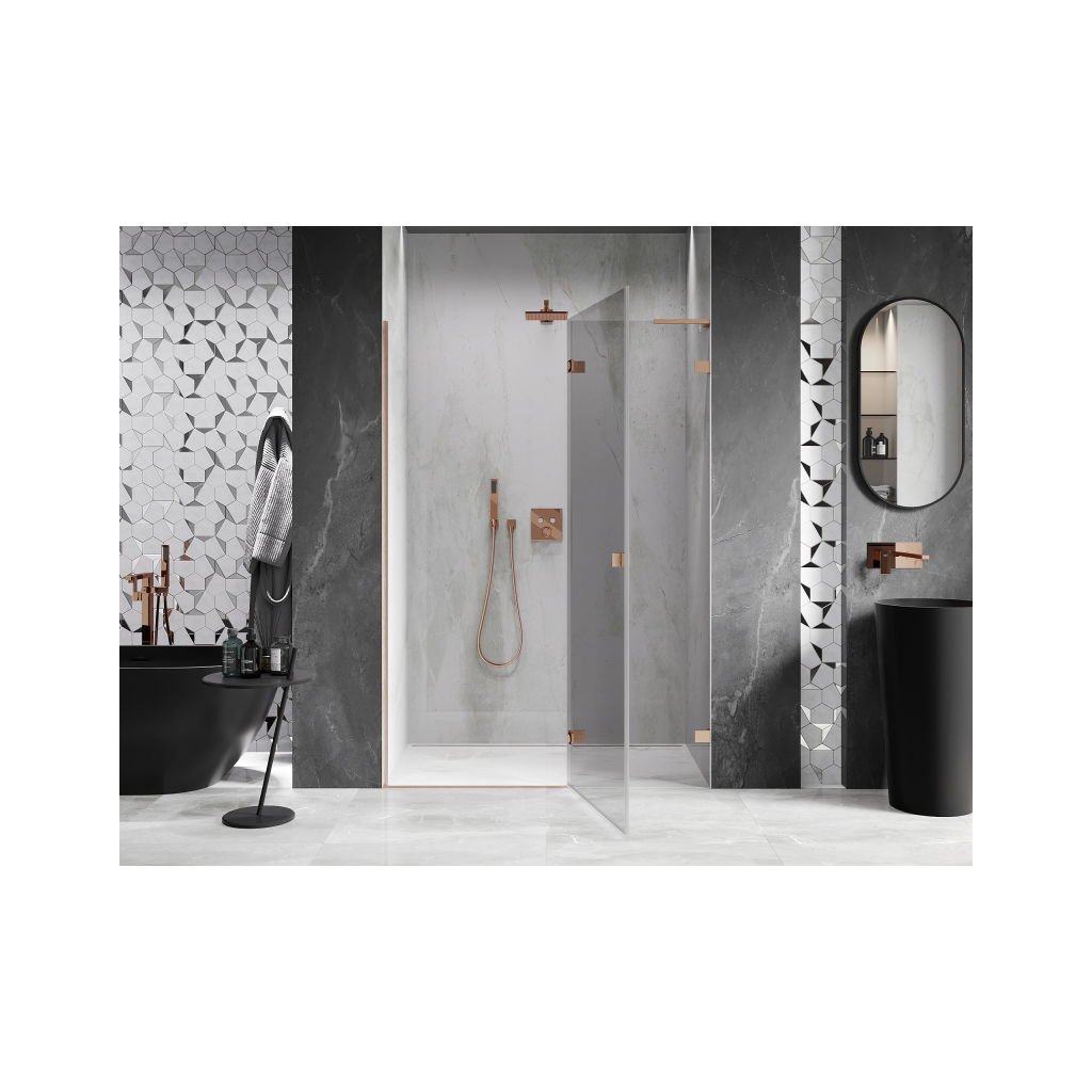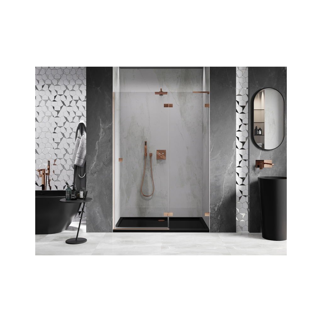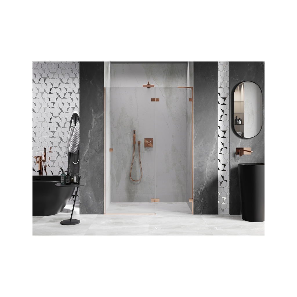 Több méretben kapható, stabil szerkezettel és csuklós ajtókkal rendelkezik. Az EasyClean felületű edzett üveg leegyszerűsíti a karbantartást, a szálcsiszolt réz profil pedig modern fürdőszobákba illik.