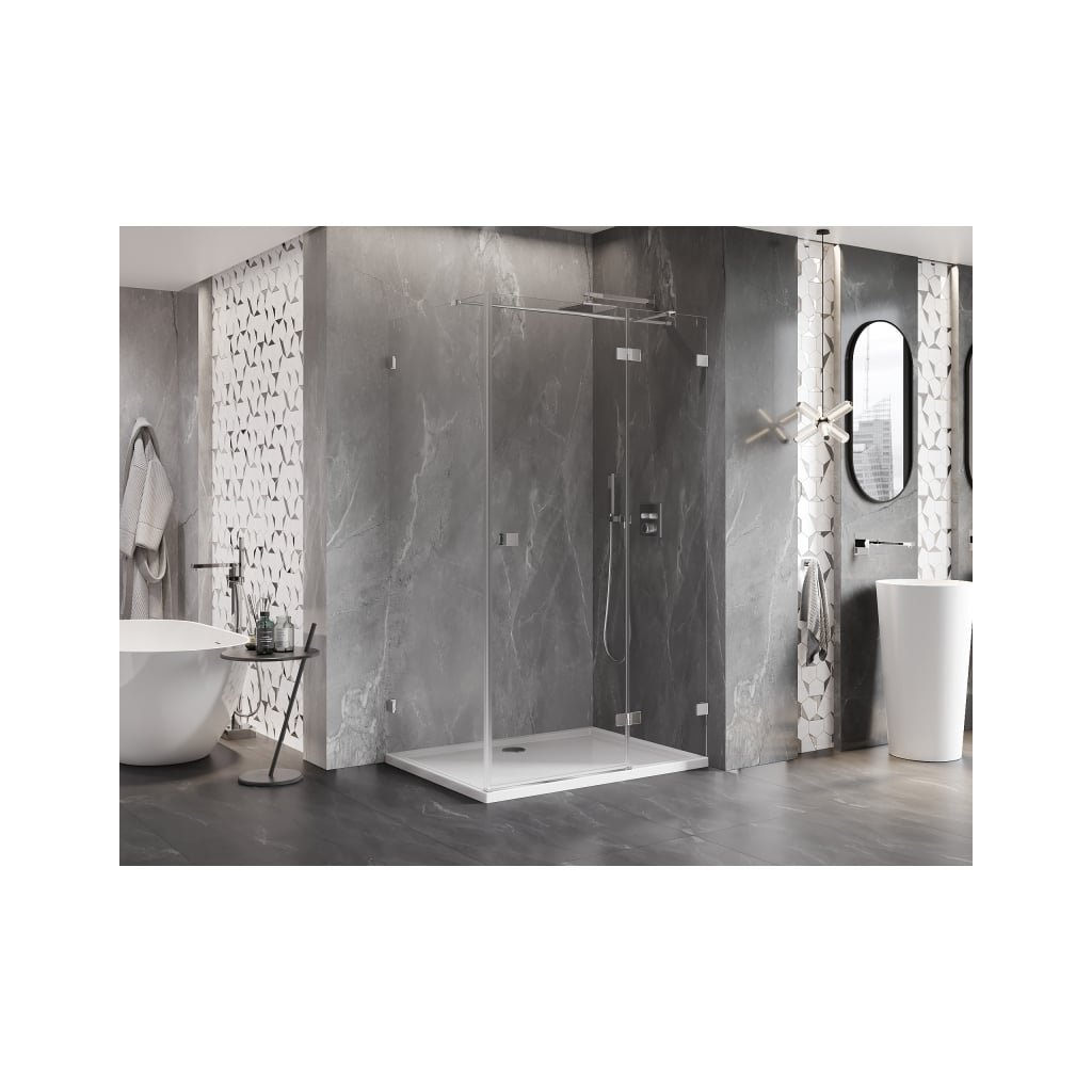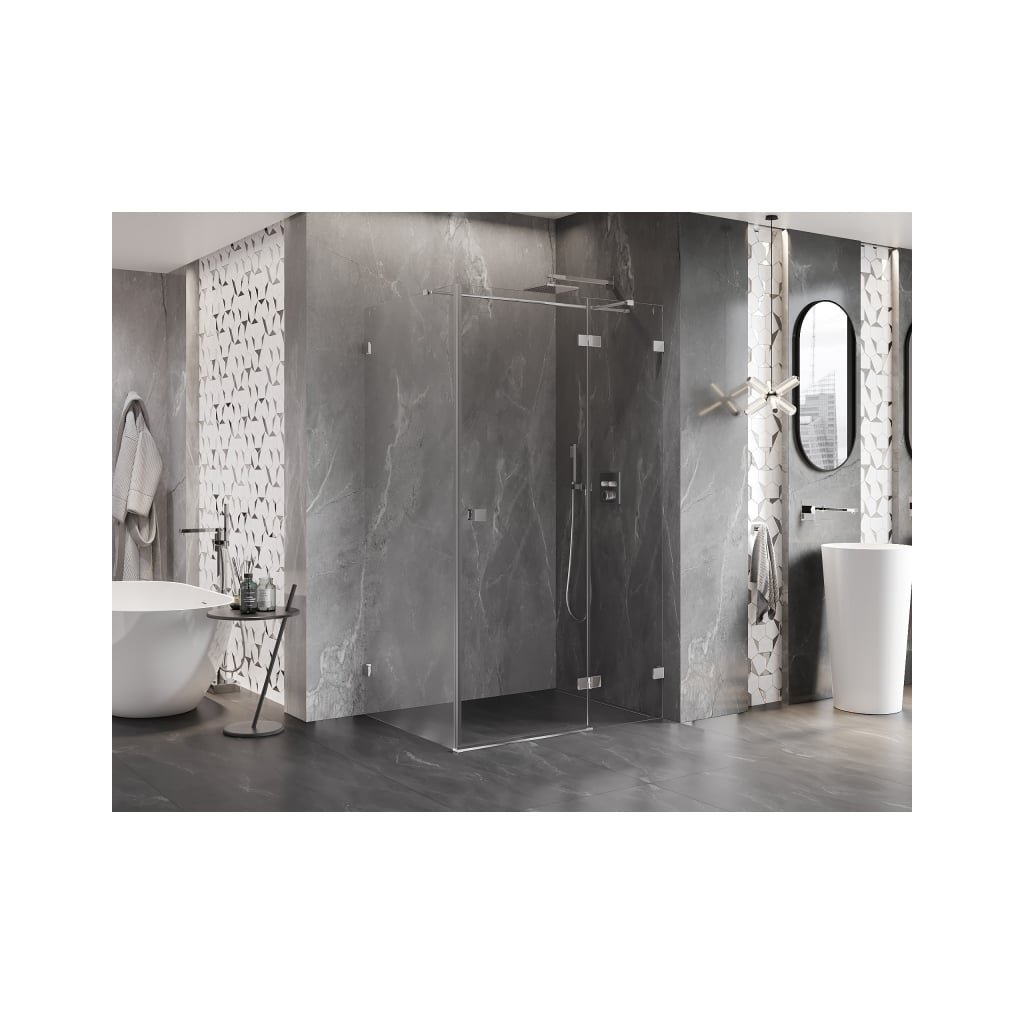100 × 90 cm-es konfigurációban stabil szerkezetet és csuklós (szárnyas) ajtókat kínál. Az EasyClean felületű edzett üveg leegyszerűsíti a karbantartást, a króm profil pedig modern fürdőszobákba illik.