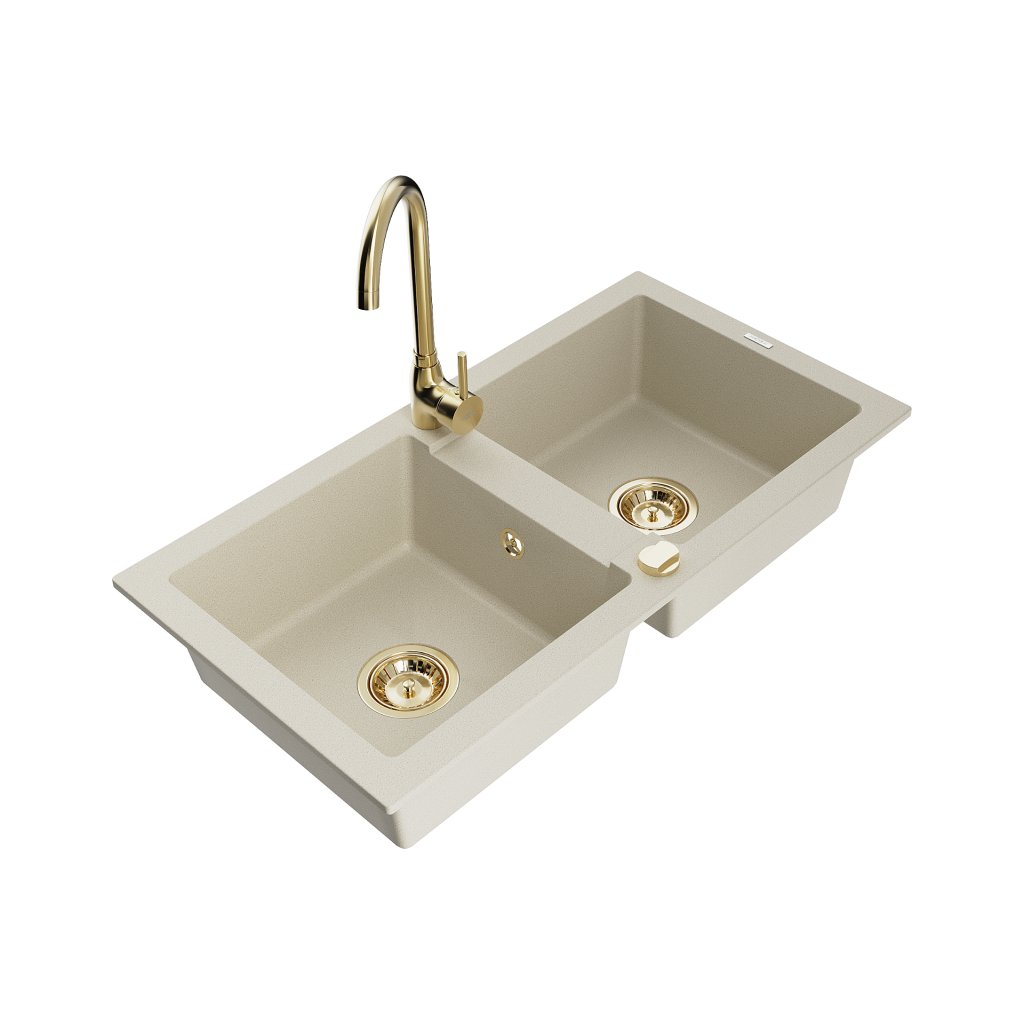 Mexen Mario, 2 kamrás gránit mosogató 820x436x161 mm és Telma arany fényes mosogató csaptelep, bézs, 6504-69-670200-50