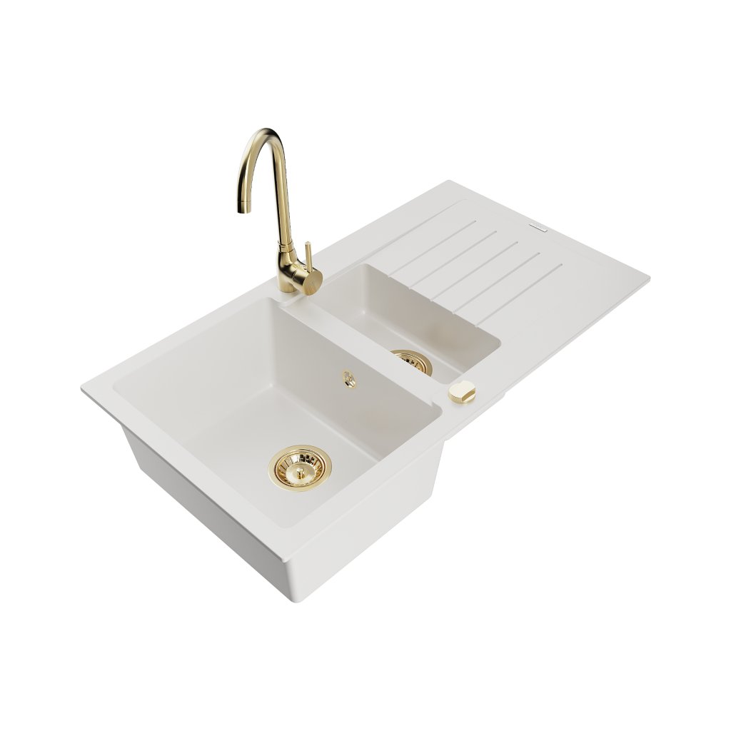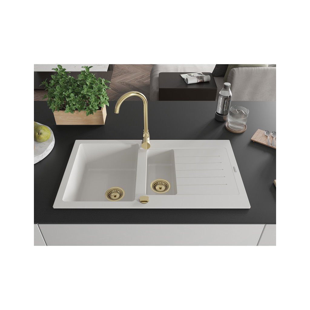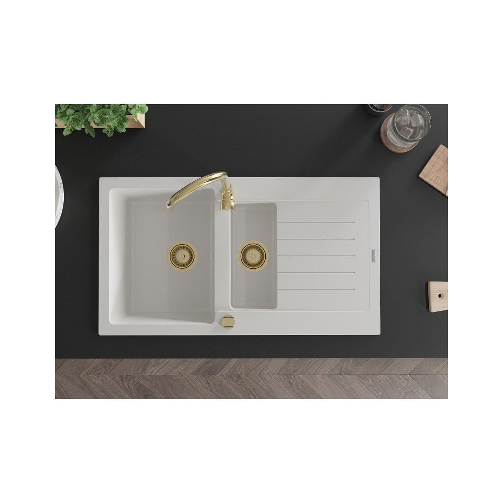 Mexen Matias, 1,5 kamrás gránit mosogató 90x50 cm-es csepptálcával Telma konyhai csapteleppel, fehér, 6502-20-670200-50