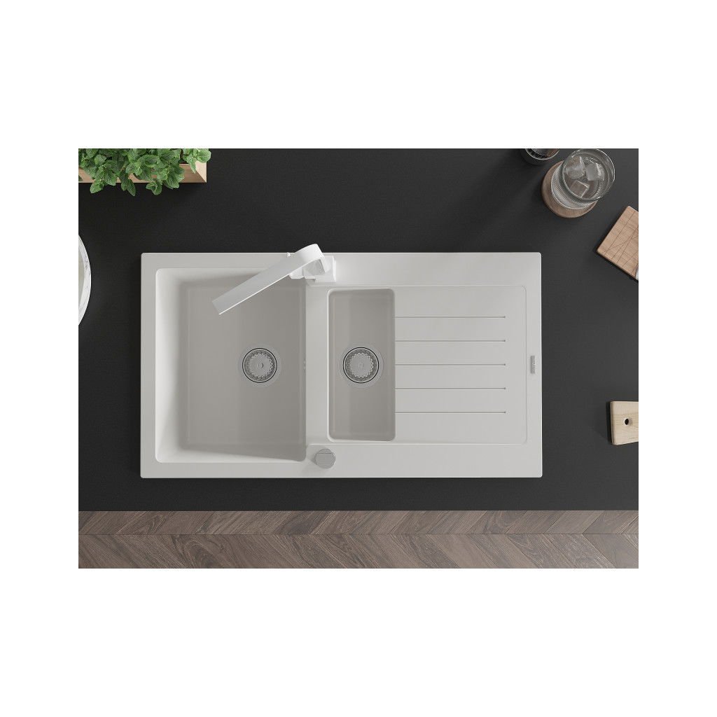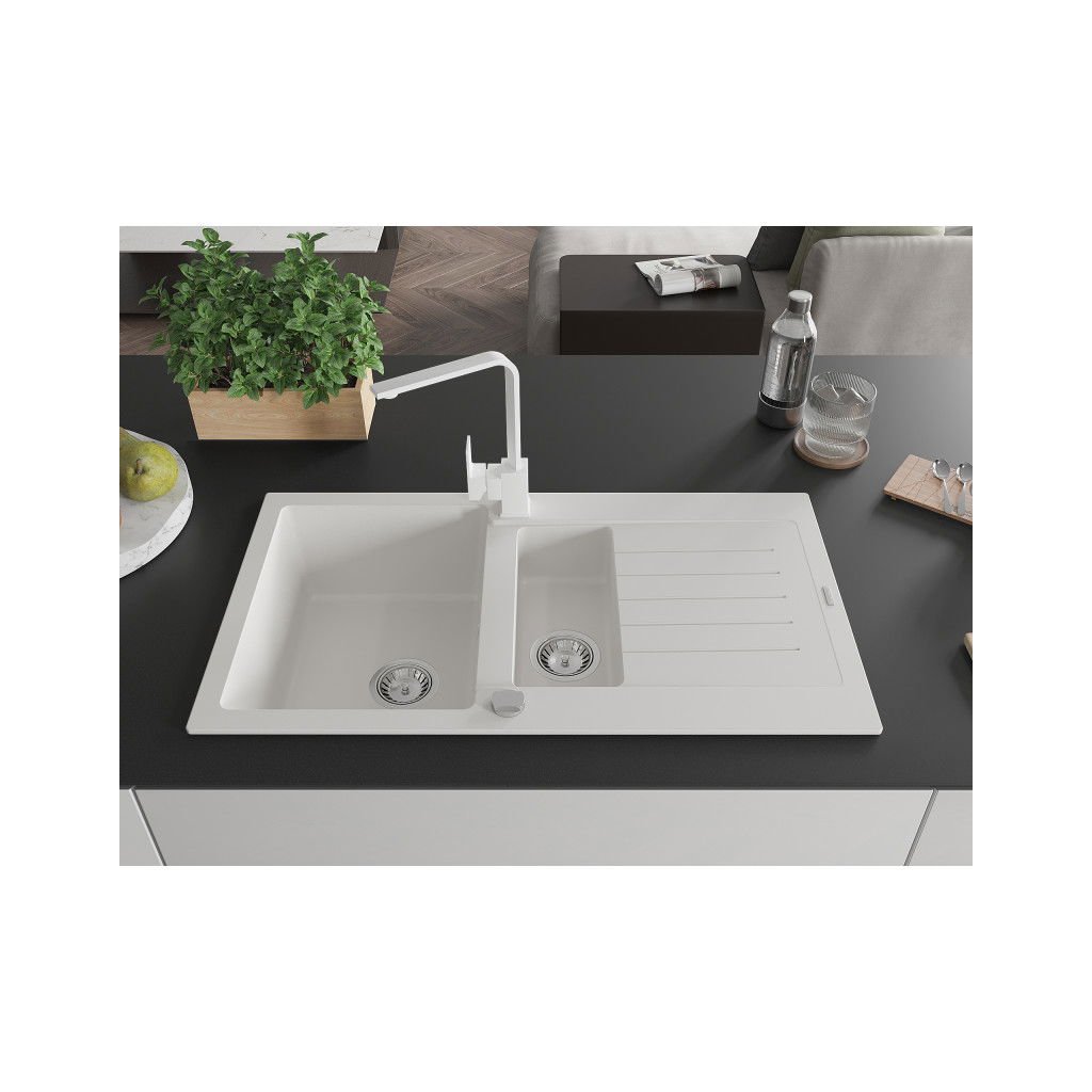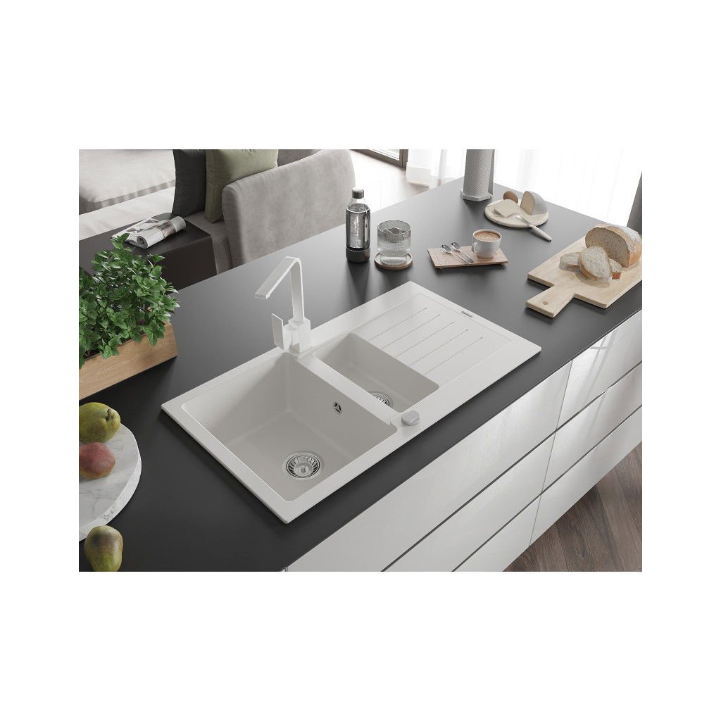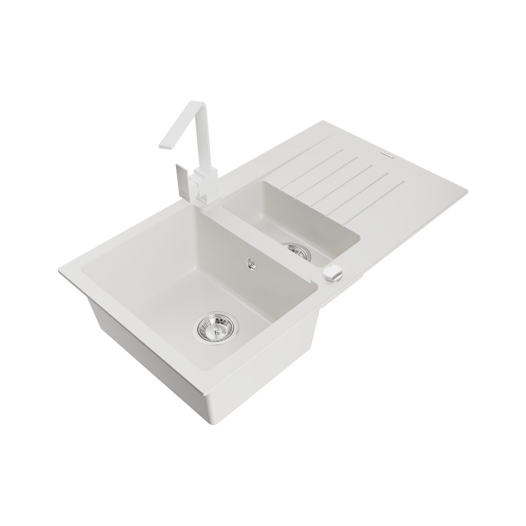 Mexen Matias, gránit mosogató 900x505x200 mm, 1,5 kamrás és fehér Rita csaptelep, fehér, 6502-20-670300-20