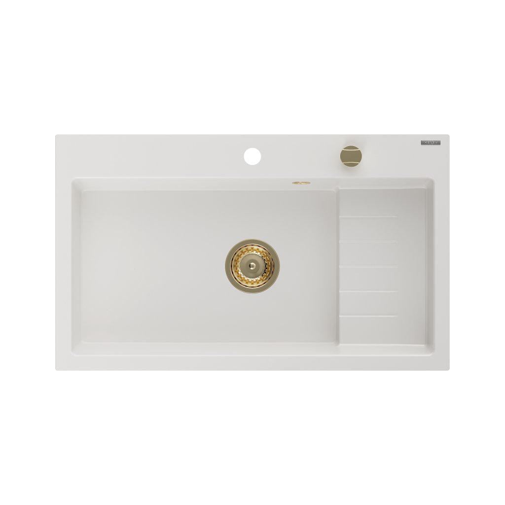 Mexen Omar, 1 kamrás gránit mosogató 800x480x210 mm, fehér, arany szifon, 6520801005-20-G