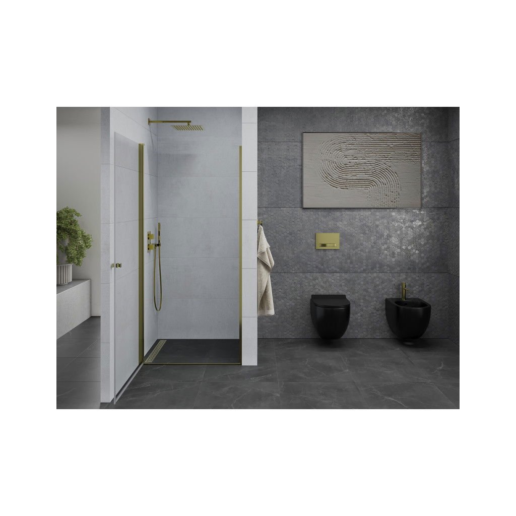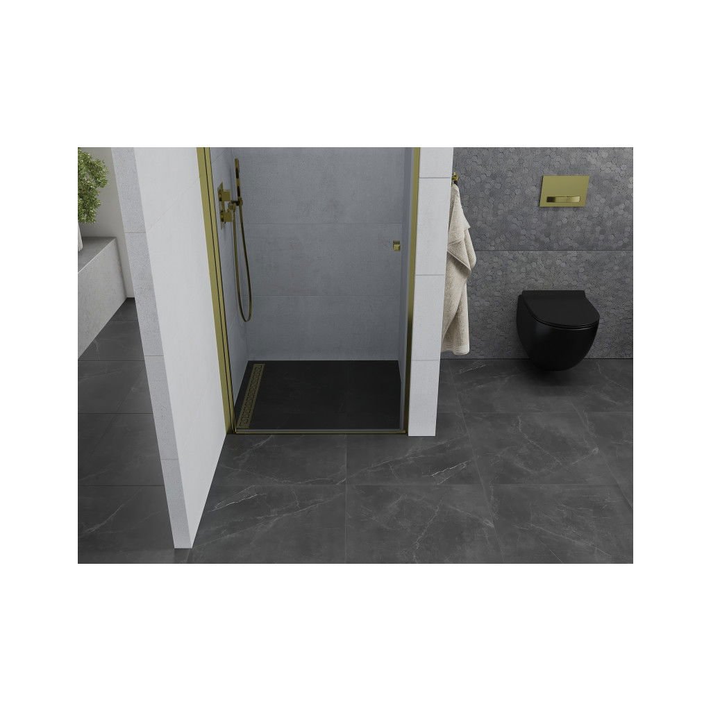 A MEXEN által kínált, 6 mm vastag, edzett üvegből készült modern zuhanyajtó a PRETORIA kollekció egyik dizájner darabja. Pretoria szárnyas ajtóval van felszerelve, amely fém fogantyúval nyílik, arany kivitelben. Az átlátszó üveg felületkezelése megkönnyíti a tisztítást és a lerakódások eltávolítását. Az ajtókeret szélessége állítható a fal kisebb egyenetlenségeinek kiegyenlítésére, és akár a csempére, akár a zuhanytálcára szerelhető.