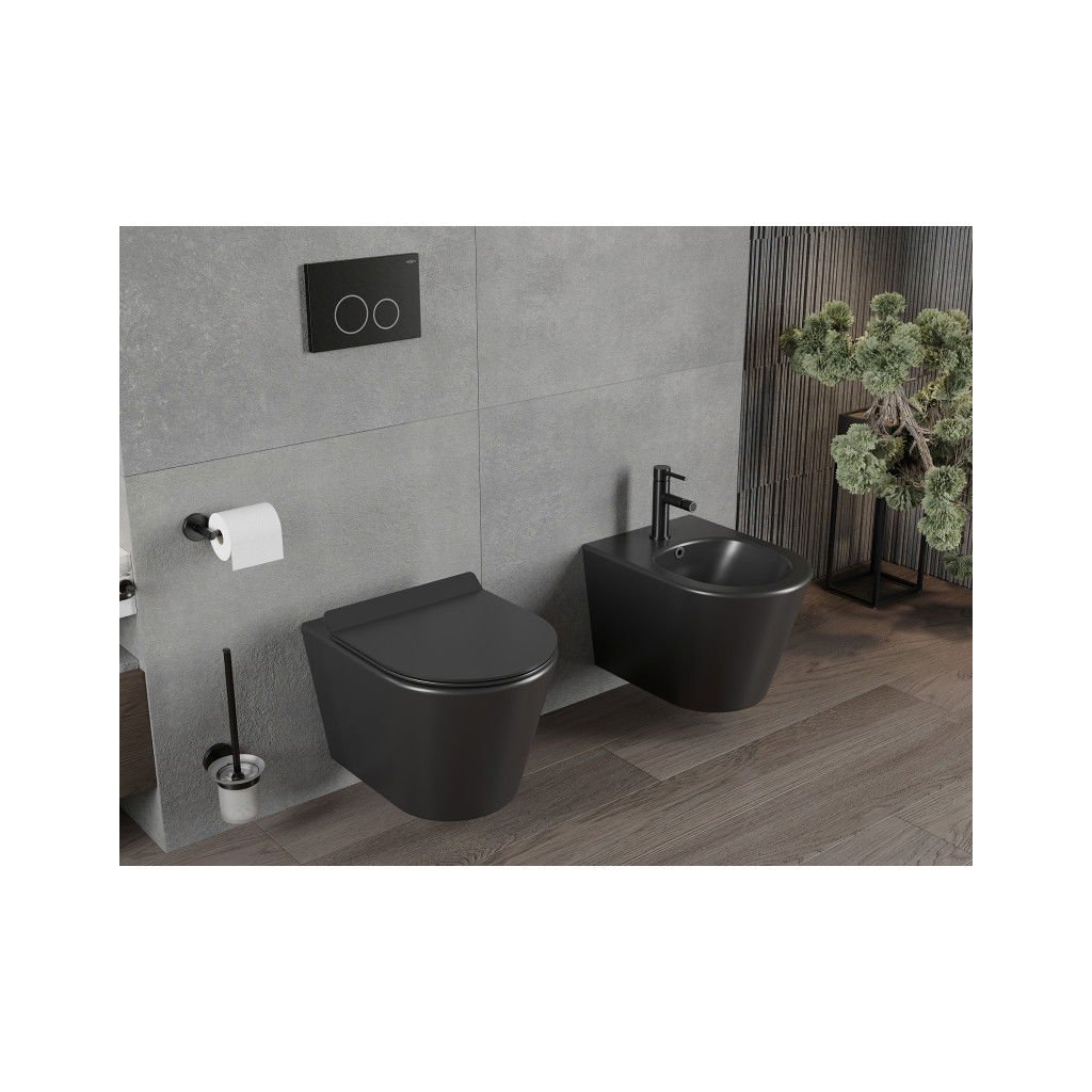 A stílusos Mexen Rico szett tartalmaz egy fekete keret nélküli függesztő tálat, szegély nélküli öblítő rendszerrel és egy lassan záródó ülőkét vékony kivitelben, hőre keményedő anyagból. A tábla fém zsanérokkal van felszerelve. Könnyen eltávolítható, ami minden bizonnyal megkönnyíti a tisztítás során a nehezen hozzáférhető helyekhez való hozzáférést, így megakadályozza a baktériumok terjedését. Ezt a lehetőséget mindenkinek ajánljuk, aki a legfunkcionálisabb megoldást keresi WC-jéhez.