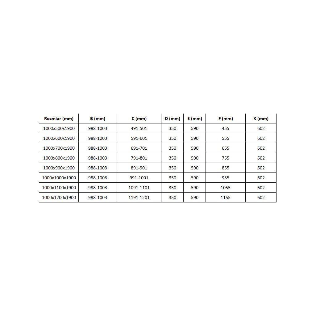 - Zuhanyajtós szakasz (B min-max): méretek az alábbi táblázatban