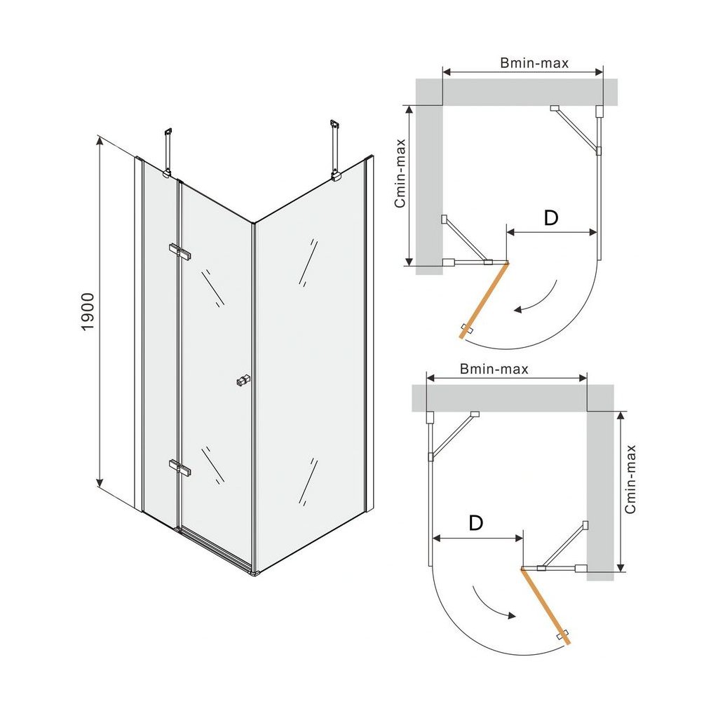 - Zuhanyajtós szakasz (B min-max): méretek az alábbi táblázatban