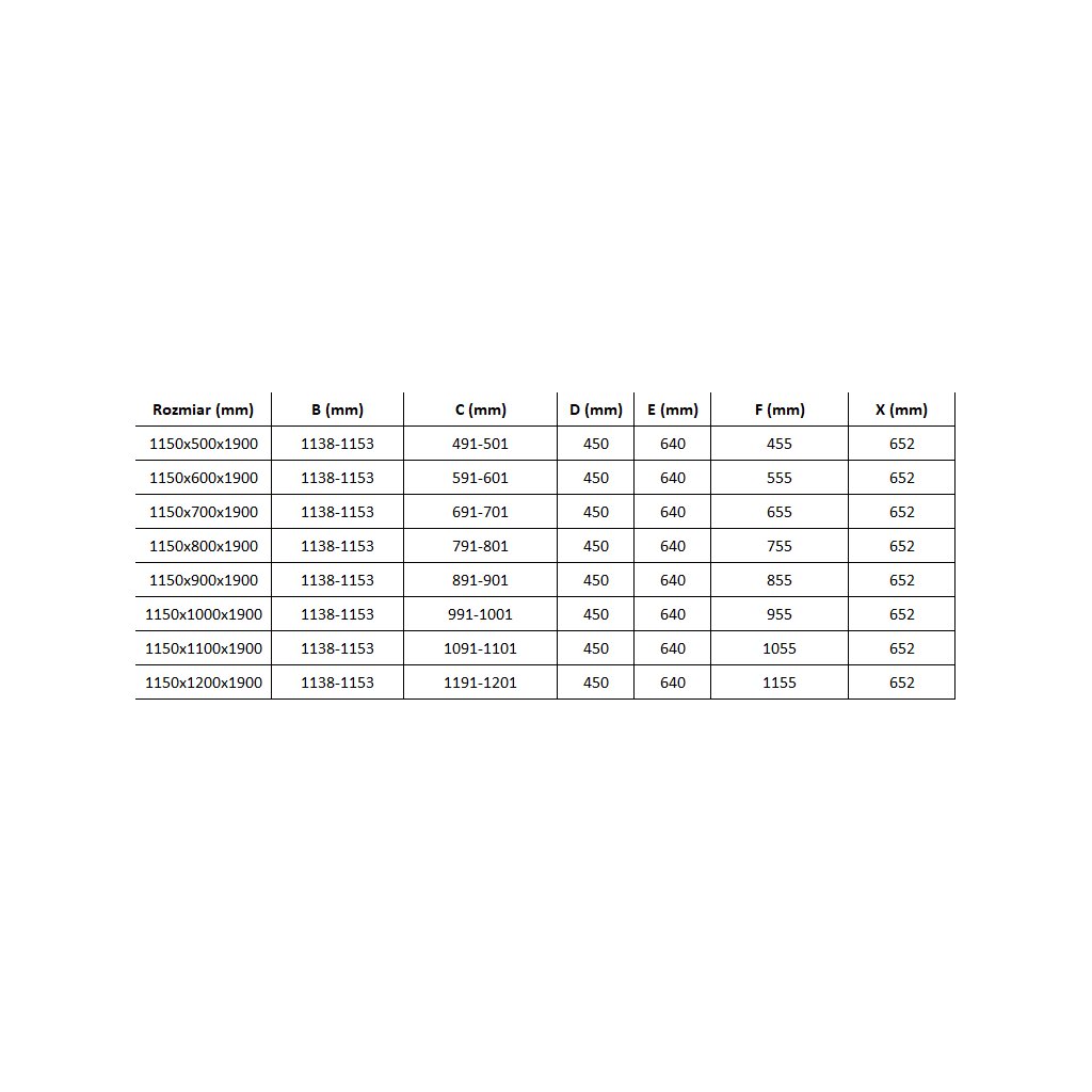 - Zuhanyajtós szakasz (B min-max): méretek az alábbi táblázatban