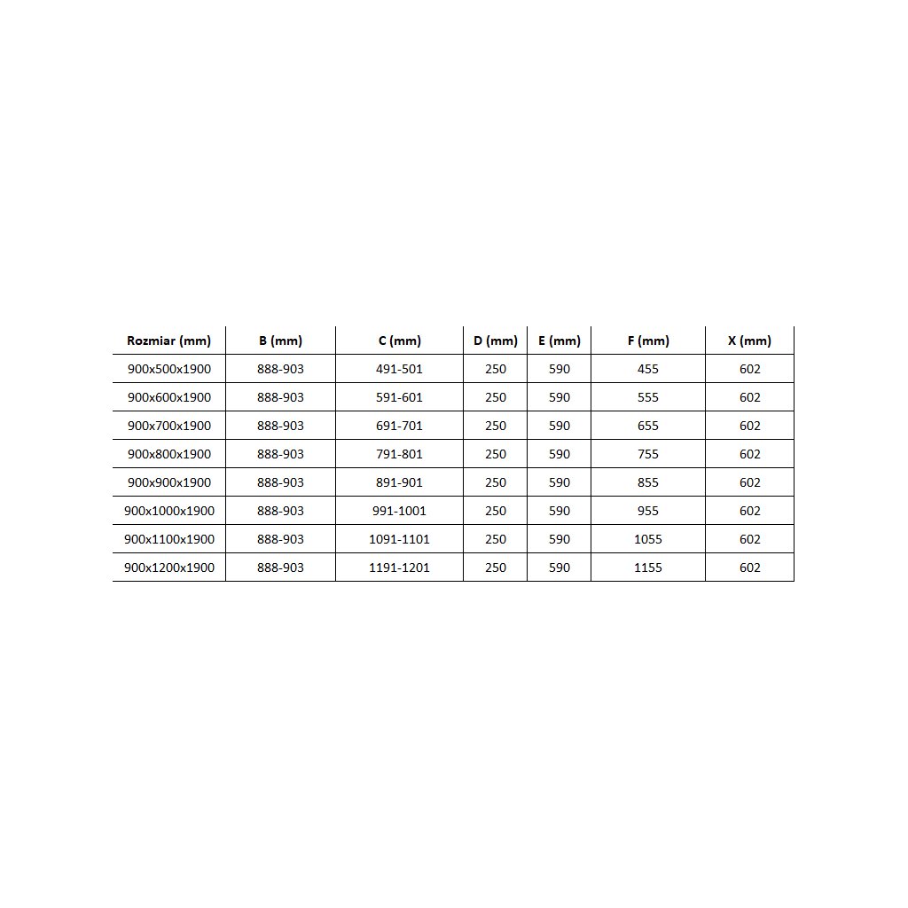 - Zuhanyajtós szakasz (B min-max): méretek az alábbi táblázatban
