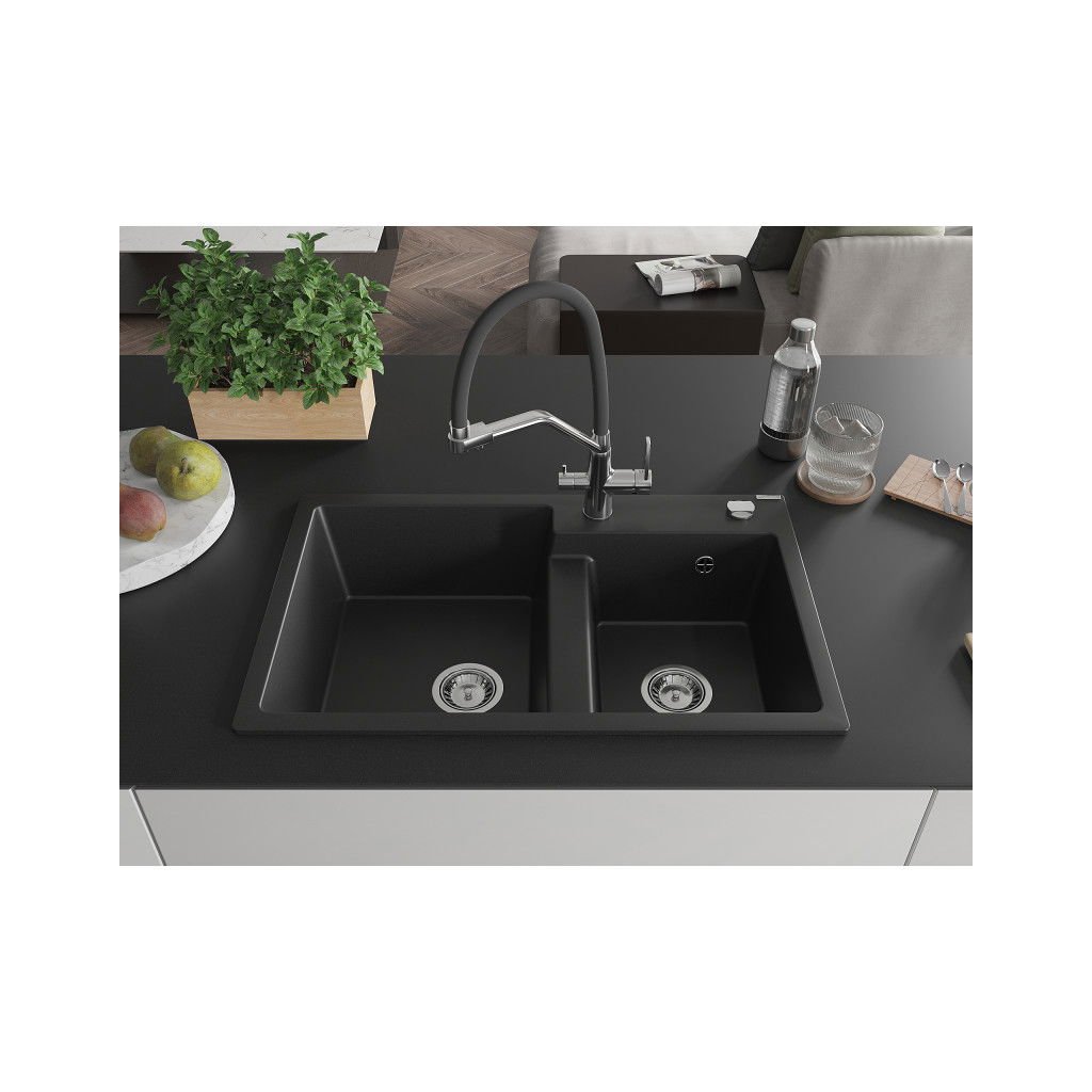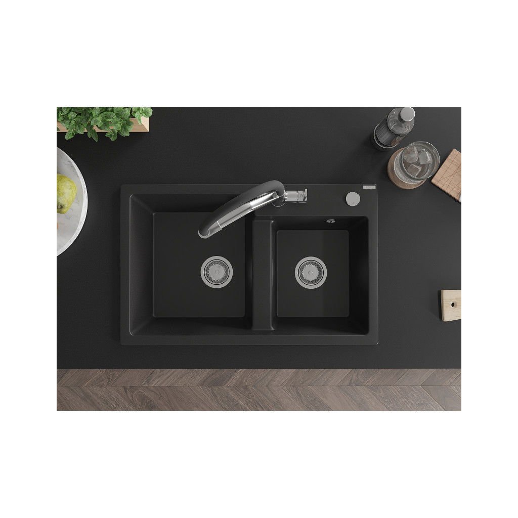 Mexen Tomas, 2 kamrás gránit mosogató 800x500x190 mm és konyhai csaptelep Duo, fekete, 6516-77-671701-07