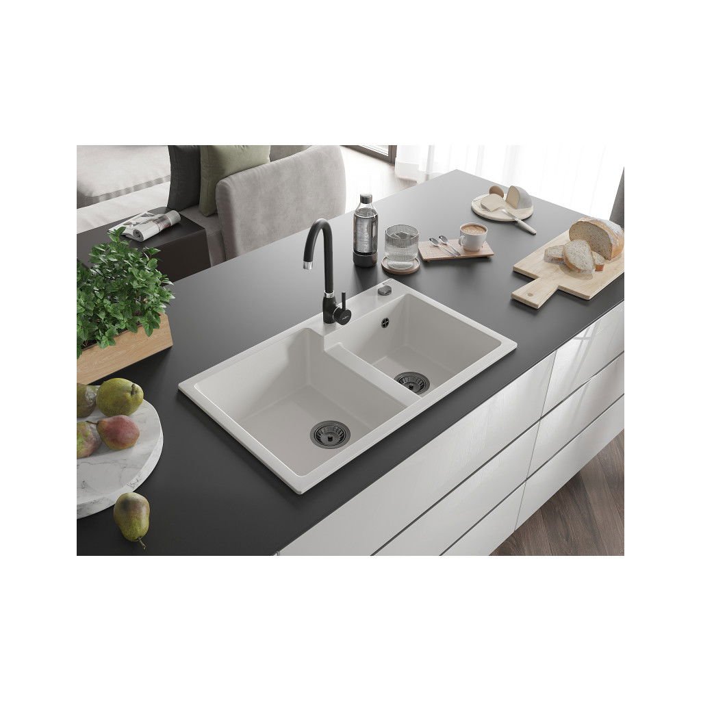 Mexen Tomas, gránit mosogató 800x500x190 mm, 2 kamrás, fehér, fekete szifonnal, 6516802000-20-B