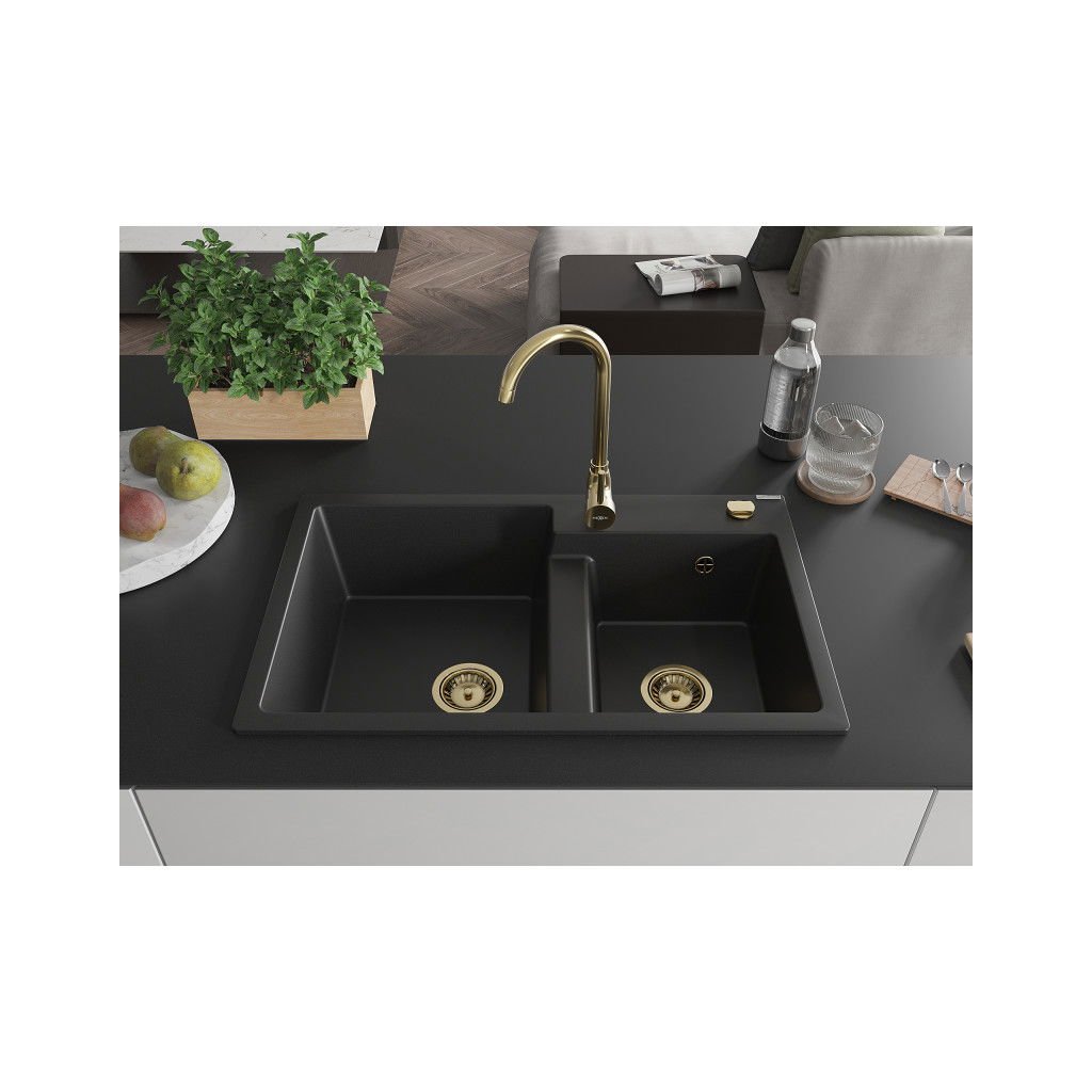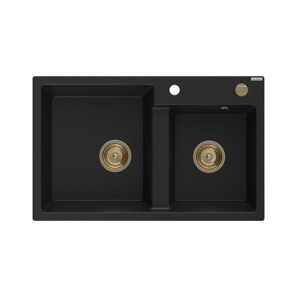 Mexen Tomas, gránit mosogató 800x500x190 mm, 2 kamrás, fekete, arany szifonnal, 6516802000-77-G