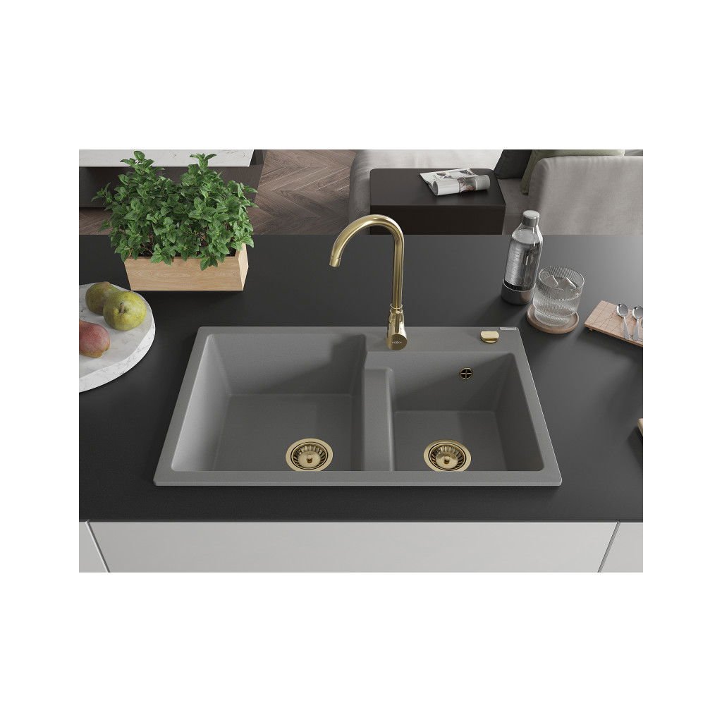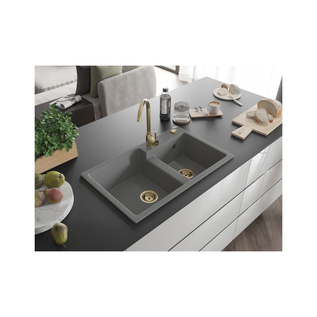 Mexen Tomas, gránit mosogató 800x500x190 mm, 2 kamrás, szürke, arany szifonnal, 6516802000-71-G