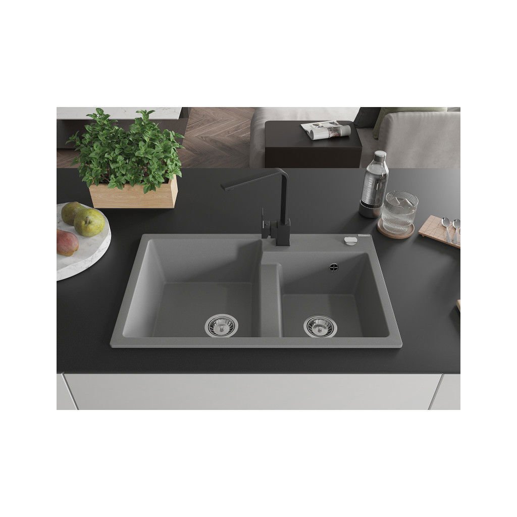 Mexen Tomas, gránit mosogató 800x500x190 mm, 2 kamrás és fekete csaptelep Rita, szürke, 6516-71-670300-70