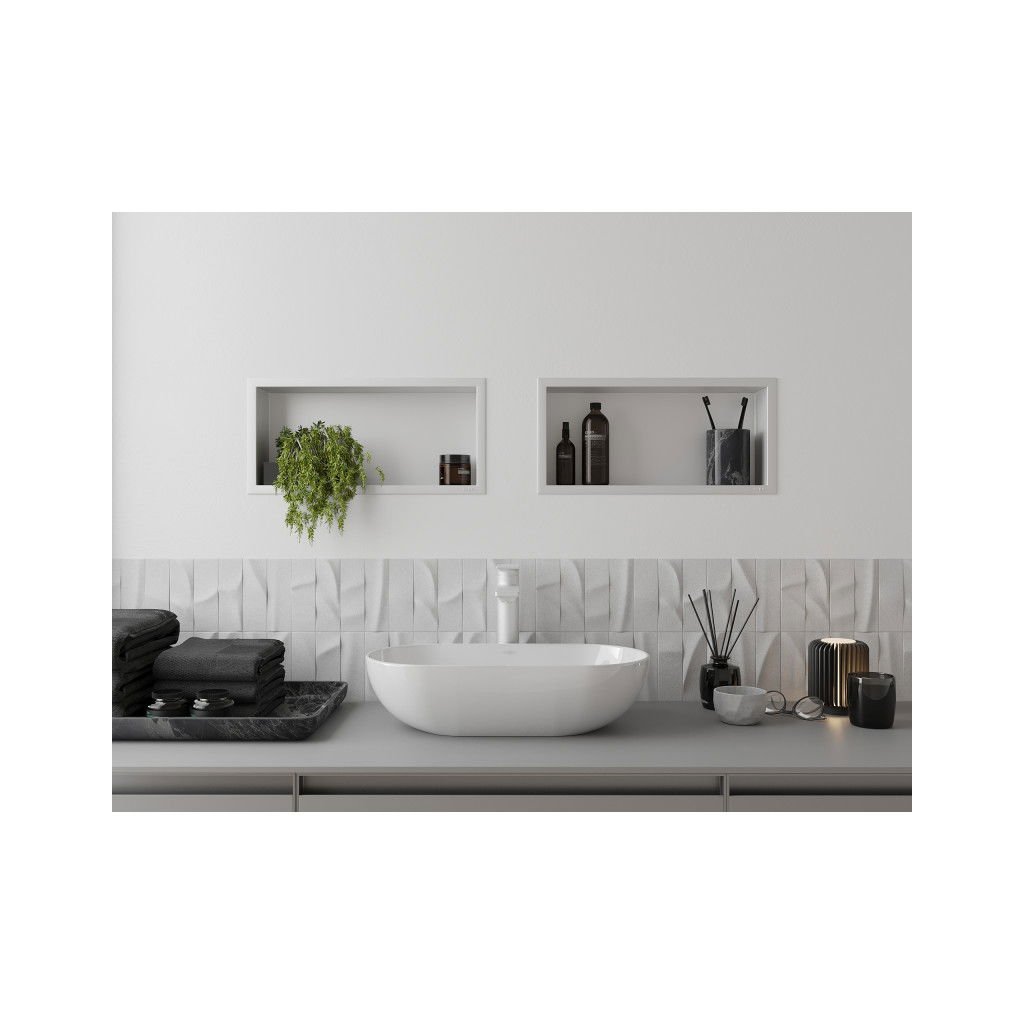 - Típus: falba ágyazható polc burkoláshoz
