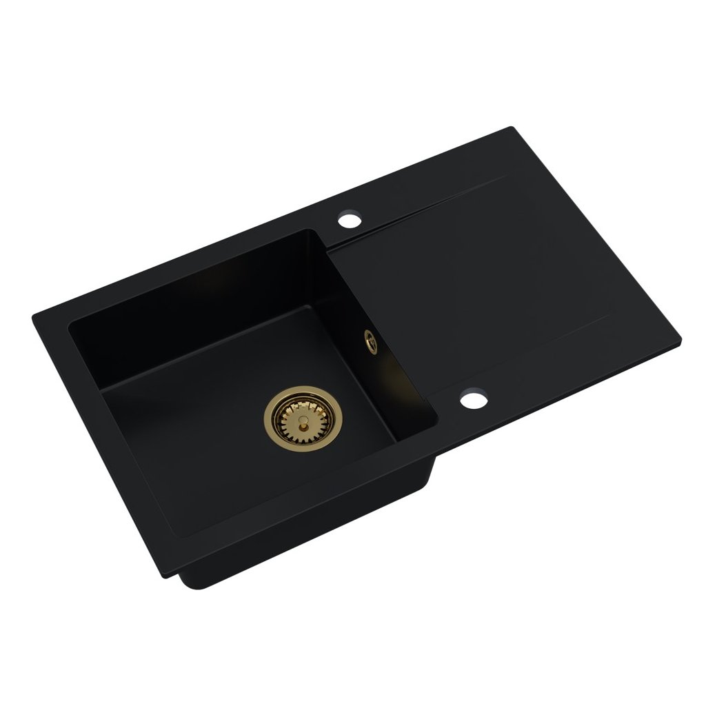 Mosogató Quality Ferrum, konyhai gránit mosogató 770x450x190 mm + arany szifon, fekete, SKQ-FER.C.1KDO.XG