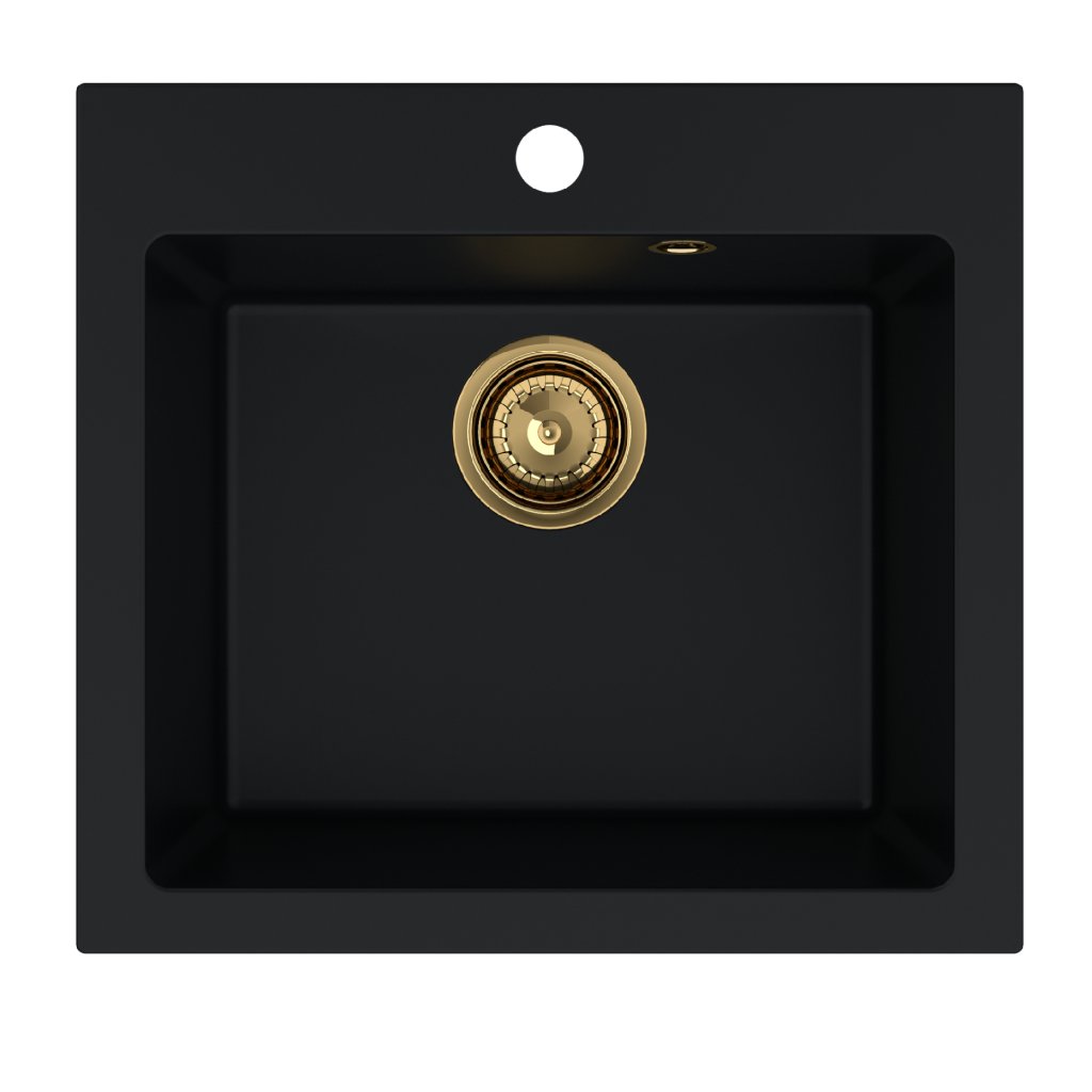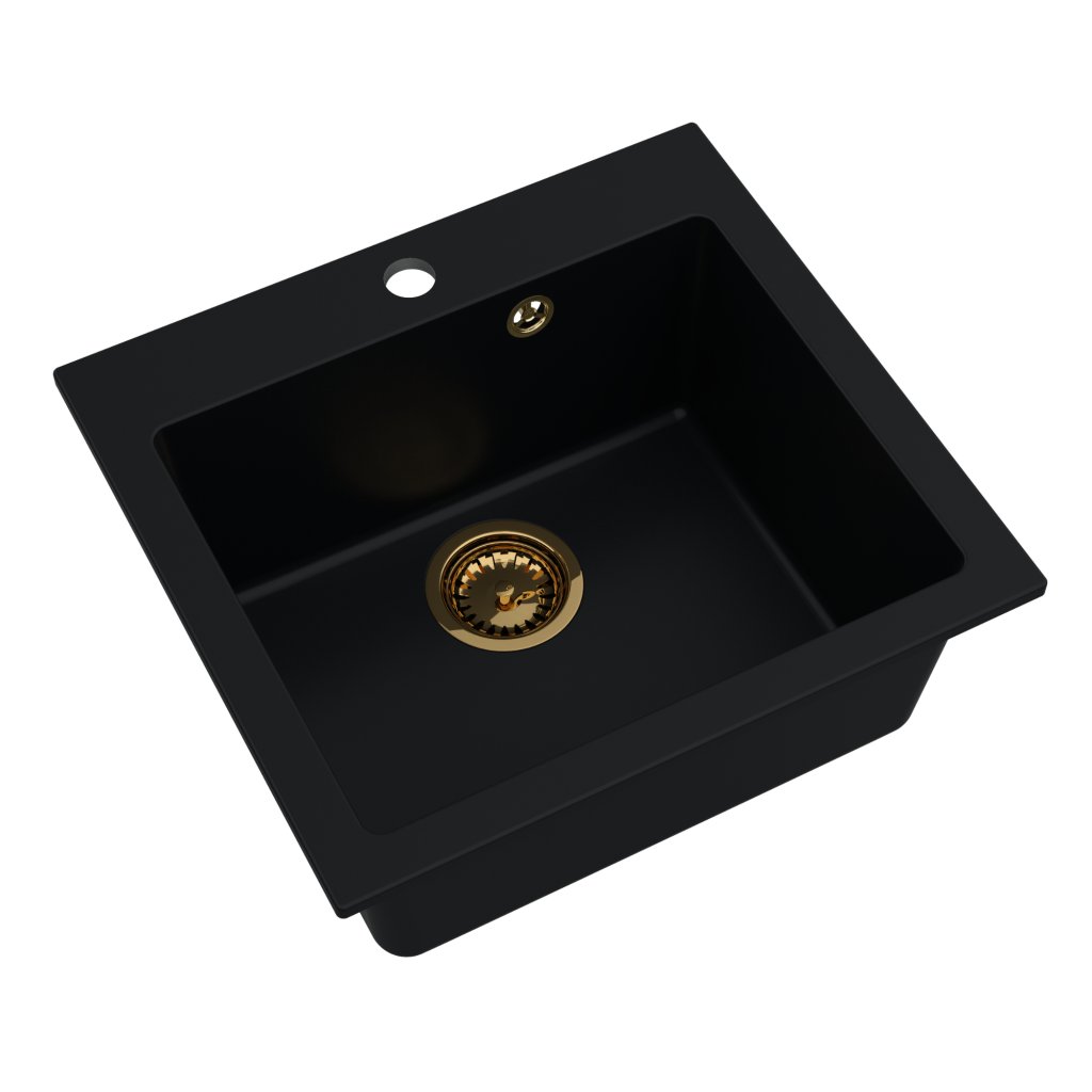 Mosogató Quality Ferrum 50, konyhai gránit mosogató 490x450x195 mm + arany szifon, fekete, SKQ-FER.C.1K50.XG