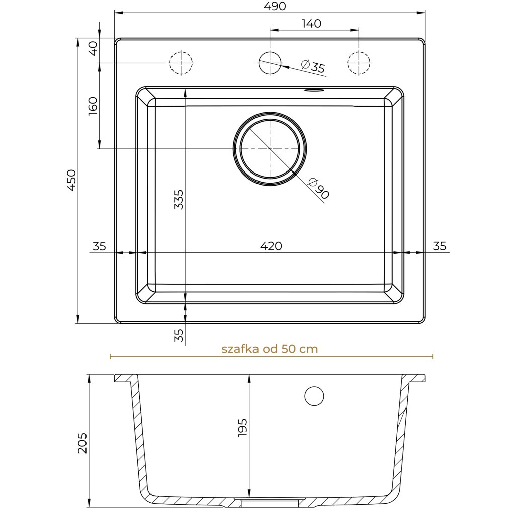 A konyhai mosogató gyárilag vágott középső furattal rendelkezik a csap számára. Ezenkívül a termékben van egy leeresztő nyílás a fűrész és a szifon számára (átmérő 90 mm), valamint egy túlfolyónyílás. Ennek köszönhetően az összeszerelés gyors és nem igényel professzionális felszerelést. Ugyanakkor a mosogatókon van hely egy másik alulról megjelölt lyuk számára. Használja adagoló, automatikus szifondugó vagy vízszűrő felszerelésére. Fúrja ki a lyukat mérés nélkül egy vonalban egy 35 mm-es gyémánt lyukfúróval.