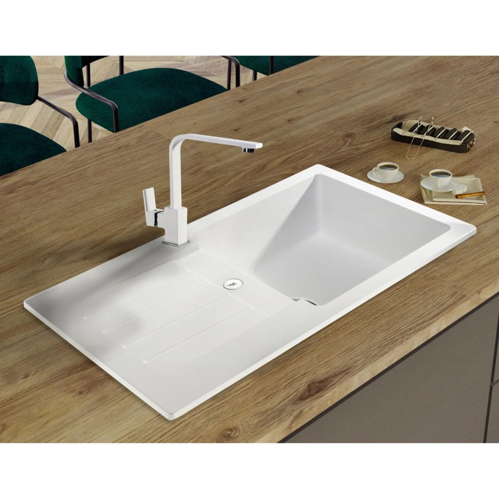 Konyhai mosogató fehér színben. Meleg, enyhén foltos árnyalat - feldobja belső dekorációját. Ideális skandináv, boho vagy japán konyhákba. A sima, enyhén foltos felület megkönnyíti a mosogató tisztán tartását. A Natalie modell felülről a munkalapba való beágyazásra szolgál. A Natalie sorozat népszerű 1-kamrás, csepegtetővel ellátott változatként kapható.