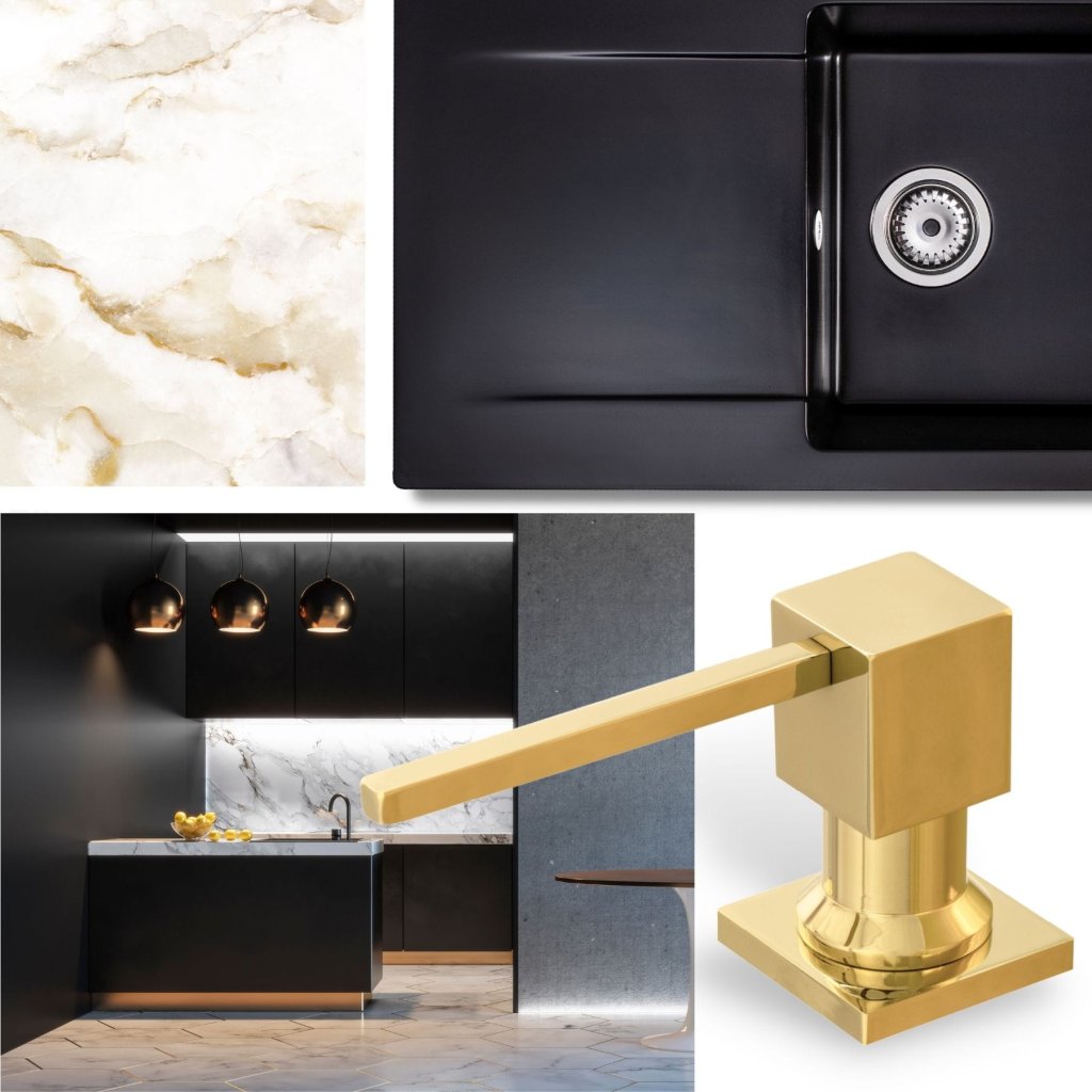 - kontrasztos szín kiválasztása, amelyre példa a fekete csap és a mosószer-adagoló választása fehér konyhai mosogatóval kombinálva