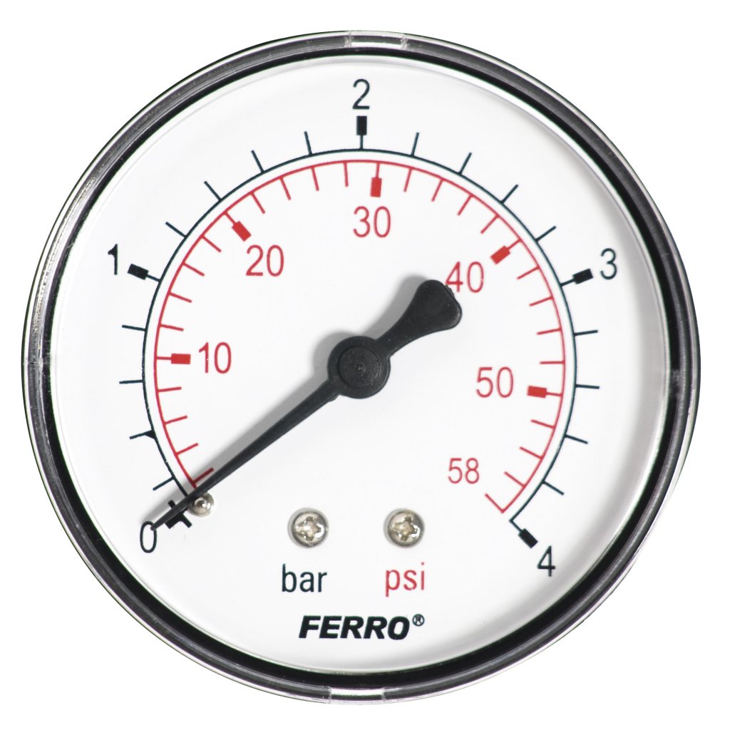 Axiális nyomásmérő • Alumínium test - porszórt • Ház: ABS nagy szilárdsággal, karcálló • Pontossági osztály: 2,5 • Test átmérő: 63 mm • Nyomástartomány: 0-4 bar • Csatlakozás: 1/4 ”hátsóKiegészítő paraméterek