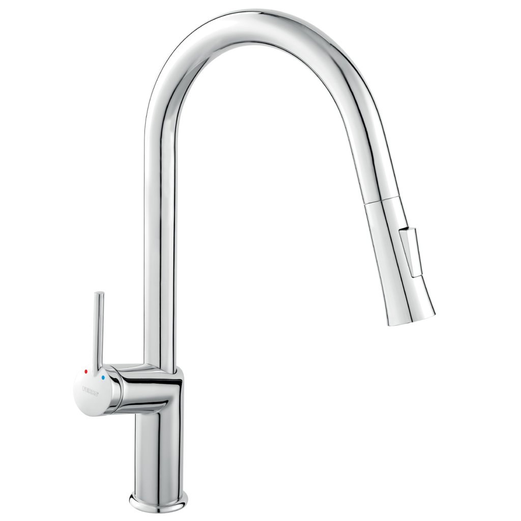 Élvezd a maximális kényelmet! Ez a krómozott csaptelep magas kihúzható karral és 2 funkcióval megkönnyíti a tartályok feltöltését és a mosogató tisztán tartását. Egyetlen mozdulattal válthatsz a vízsugár és a sugár között, és élvezheted a víz feletti nagyszerű kontrollt. A minimalista dizájn fényes króm felülettel tökéletesen illeszkedik egy modern konyhába!