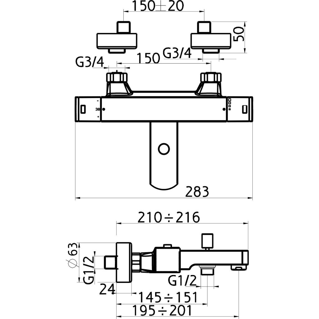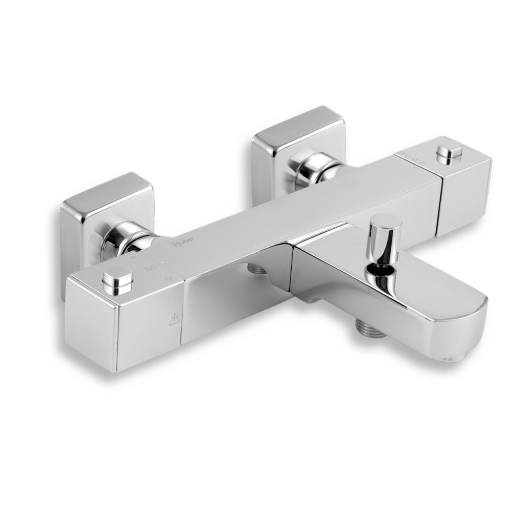 Fürdőkád termosztatikus csaptelep 150 mm-es távolsággal és reteszelő kapcsolóval. Az egyedülálló COLD TOUCH rendszer - AQUASAVE fali csaptelepek a bal fogantyún hőmérséklet-szabályozással, a jobb oldalon pedig áramlásszabályzóval rendelkeznek. Ennek az elrendezésnek az az előnye, hogy rövidebb a melegvíz-ellátás távolsága a termosztáttól, és ezáltal a csapfelület kevésbé melegszik fel. Tartós termosztatikus kazetta 7 év garanciával . Első osztályú króm kivitel. Tökéletes és kifejező – szögletes formáival biztosan tetszeni fog. Ez a termosztatikus csaptelep a fürdőszobájába is illeszkedik.