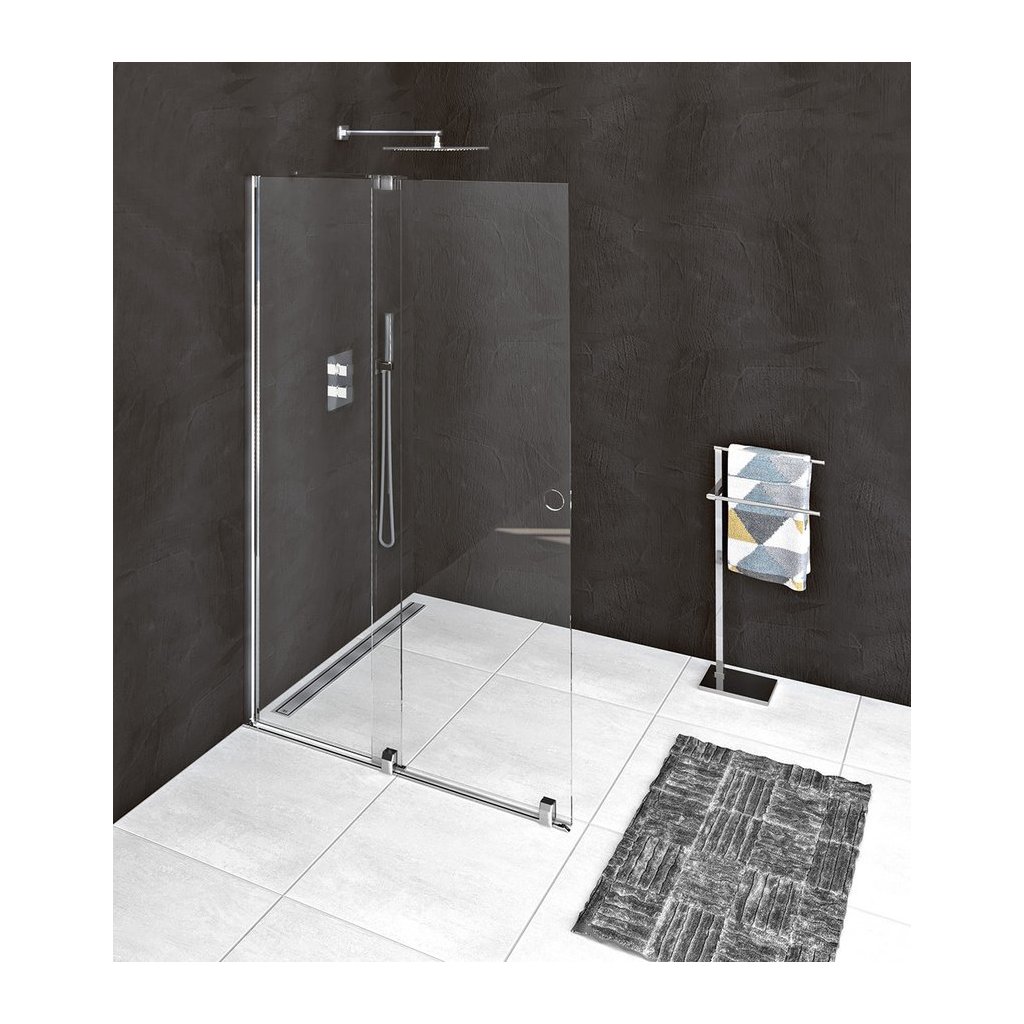 Kétrészes képernyő, rögzített és csúszó részből áll. A csúszó rész a csapágykerékpárokon egy vékony sín mentén mozog, amely egyben túlfolyó rudat is képez. A kihúzható ajtó maximális szélessége 120 cm. A szélesség a sín lerövidítésével és a végütközőnek a sínen és az üvegen történő elhelyezésével állítható 70-120 cm tartományban. Behelyezve mindössze 70 cm széles, ami praktikus megoldás, amely helyet takarít meg a fürdőszobában.