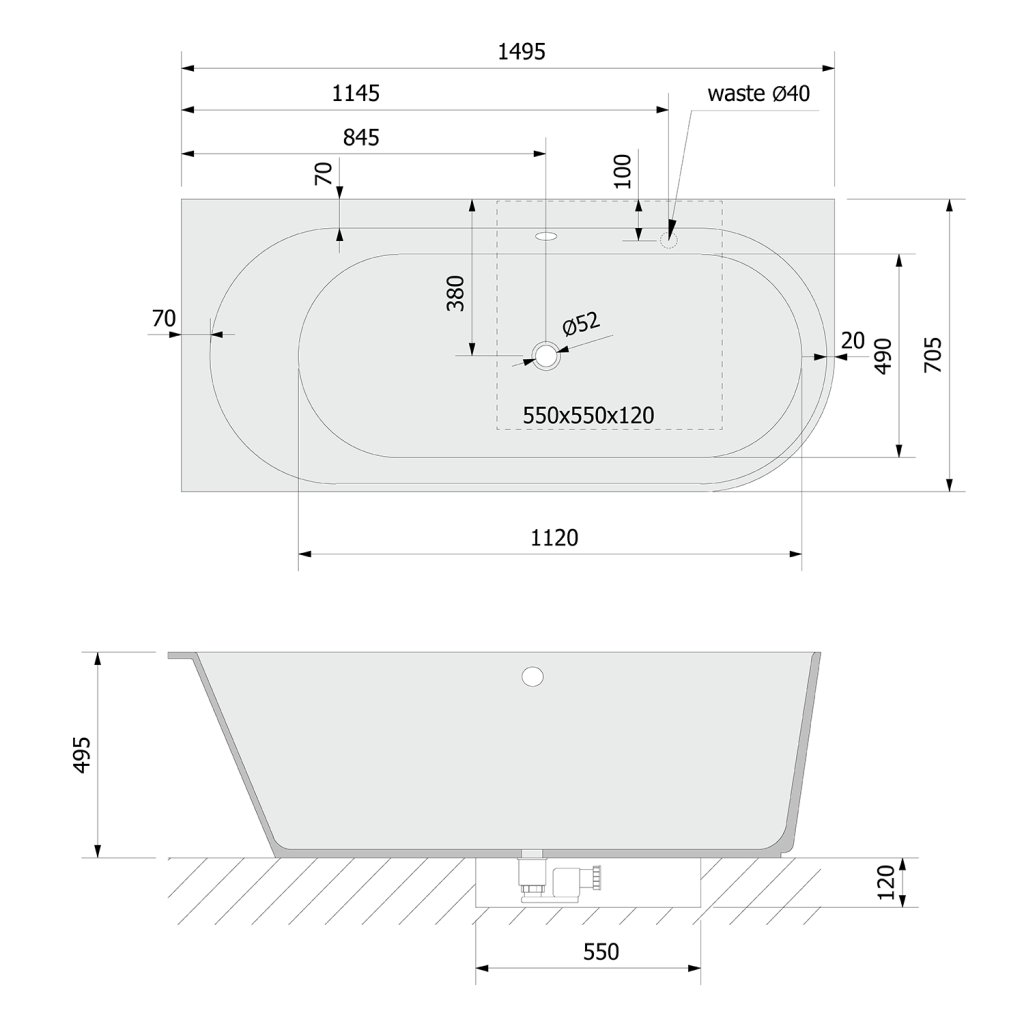 - A kádhoz legalább 675 mm hosszú túlfolyógarnitúra szükséges.