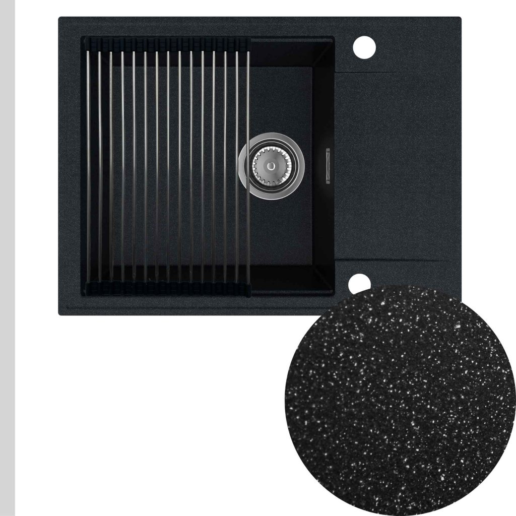 Quality Sink55 gránit mosogató, 620x460x215 mm + króm szifon, fekete pettyes, SKQ-SINK.B.1KKO.X