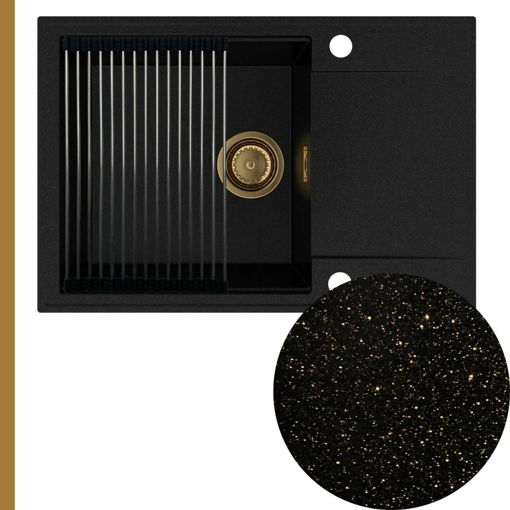 Quality Sink55 gránit mosogató, 680x460x215 mm + arany szifon, fekete, arany pöttyökkel, SKQ-SINK.L.1KDO.XG