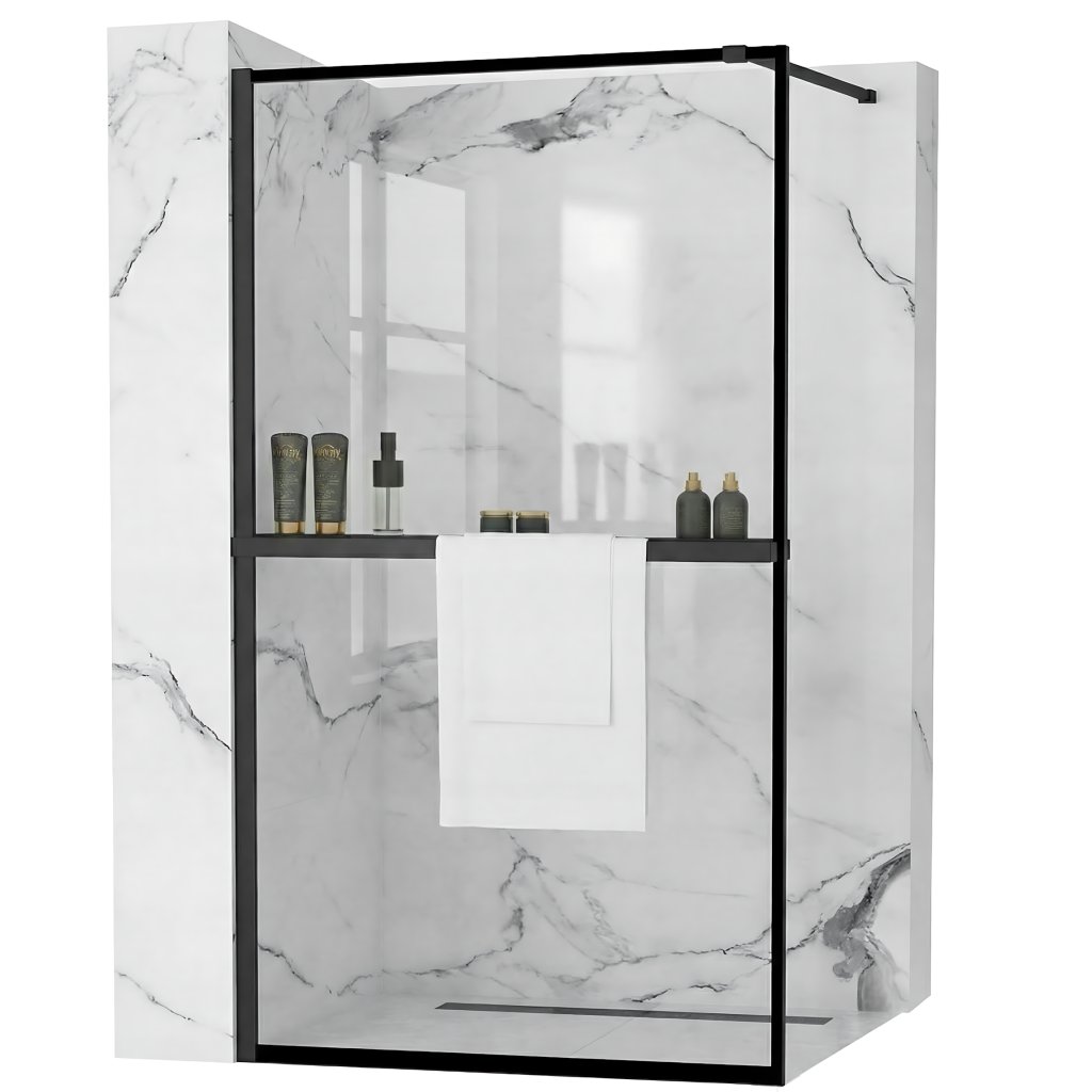 Rea Bler, zuhany paraván 100x195 cm, 8mm átlátszó üveg, fekete matt profil + EVO polc és akasztó, KPL-K7634
