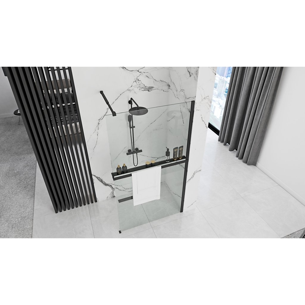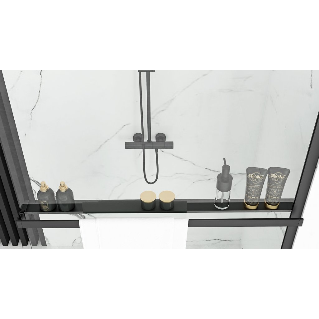 Zuhanyfal Aero praktikus berendezéssel van felszerelve polc törülközőtartóval Evo . Kiváló minőségű, matt fekete festékkel bevont alumíniumból készült, amely ellenáll a sérüléseknek és a karcolásoknak. A praktikus polc lehetővé teszi, hogy tisztán és rendezetten tartsa fürdőszobáját, modern megjelenése pedig egy újabb dekorációs eleme lesz fürdőszobájának. A polcot beszerelés előtt a zuhanyüveg szélességére kell vágni, a polc maximális hossza 120 cm. A beszerelési mód rendkívül intuitív, csak meg kell húzni a polcot a kívánt magasságban tartó csavarokat.