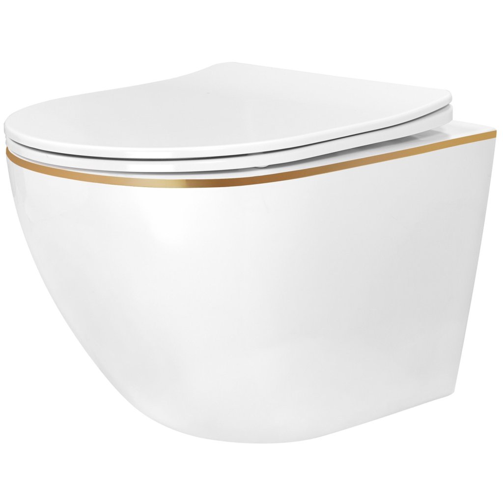 Rea Carlo Mini Tornado NF, fali WC-csésze 490x365x350mm + WC-ülőke, fehér-arany peremmel, REA-C6806