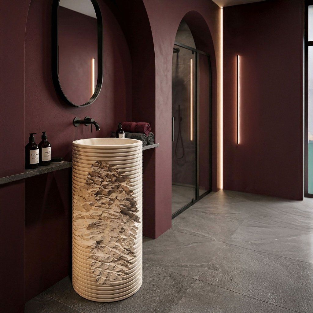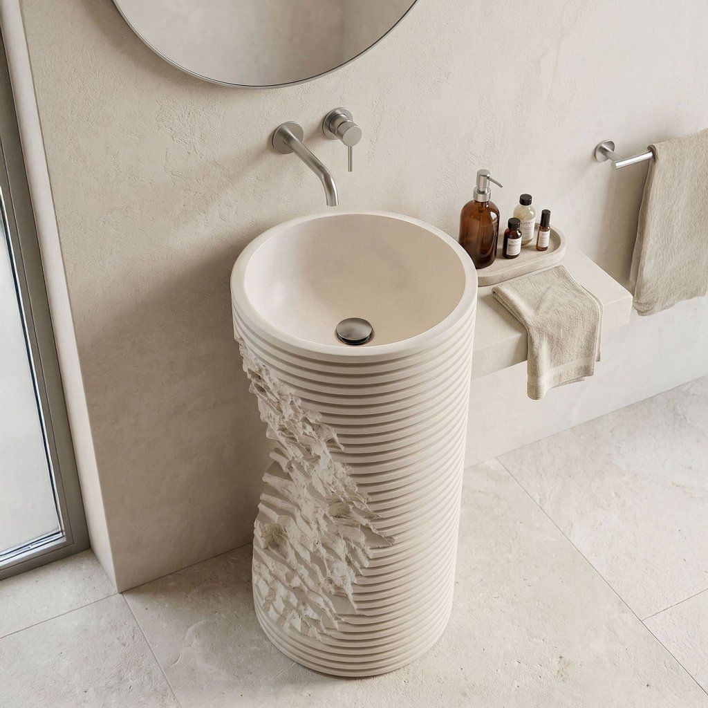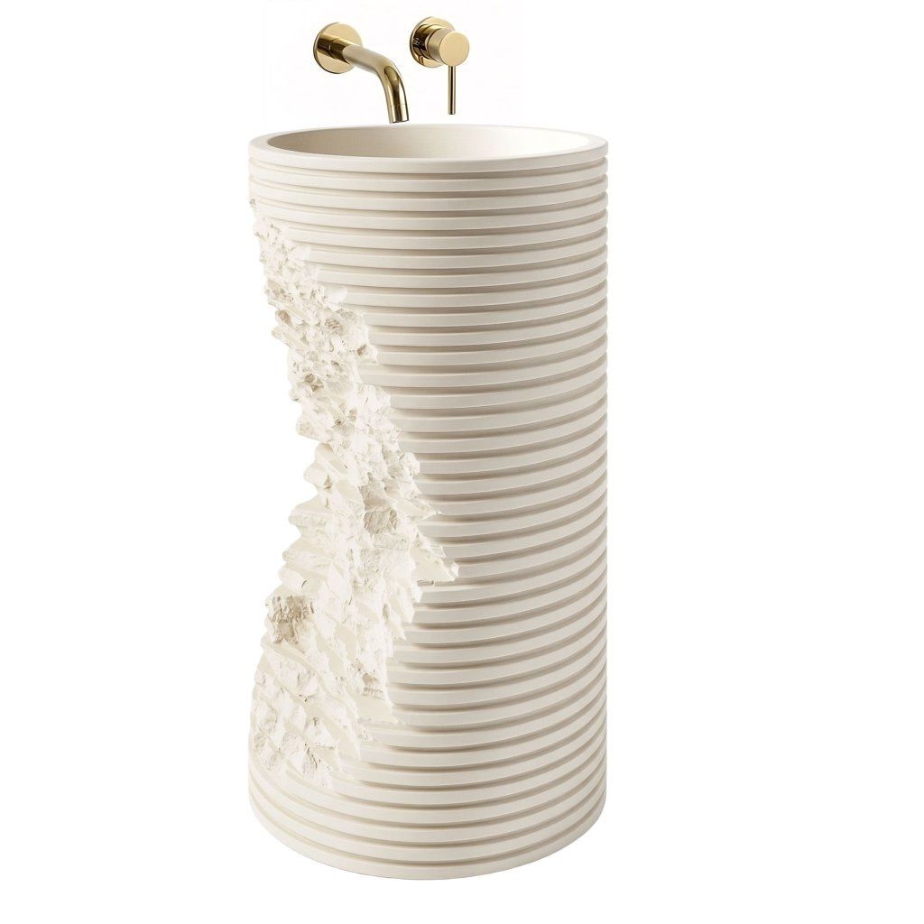 A Rea Travena Round szabadon álló mosdó egy merész építészeti gesztus, amely a fürdőszobát kiállítótérré alakítja. A hengeres külső héj barázdált felülettel réteges kőtömbökre hasonlít – és pont ott, ahol szimmetriát várnánk, a tervezők szándékosan megszakították a vonalakat egy mély, szabálytalan bevágással, pattintott kőtextúrával. Az eredmény élénk, dinamikus és kihagyhatatlan.