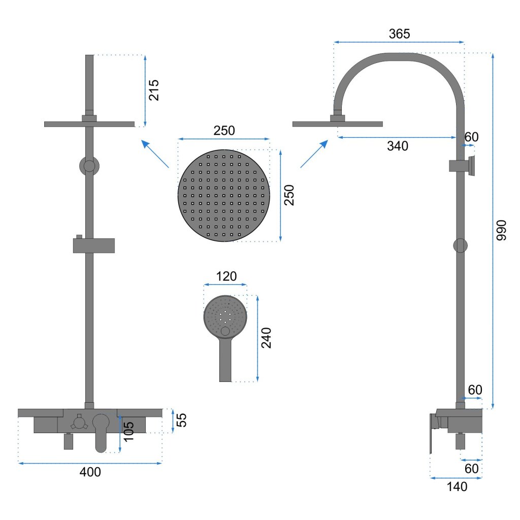 - Esőzuhany fej (felső): ABS fekete, 250x250 mm