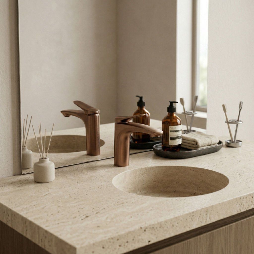 Egy bohém vagy organikus modern fürdőszobában a réz rattan kiegészítőkkel, makraméval és természetes fával harmonizál – a természetes anyagok és a kézművesség melegét idézve. A Vision Copper Brush Low alacsony formátuma diszkréten illeszkedik ezekbe a környezetekbe anélkül, hogy uralná a mosogatót.