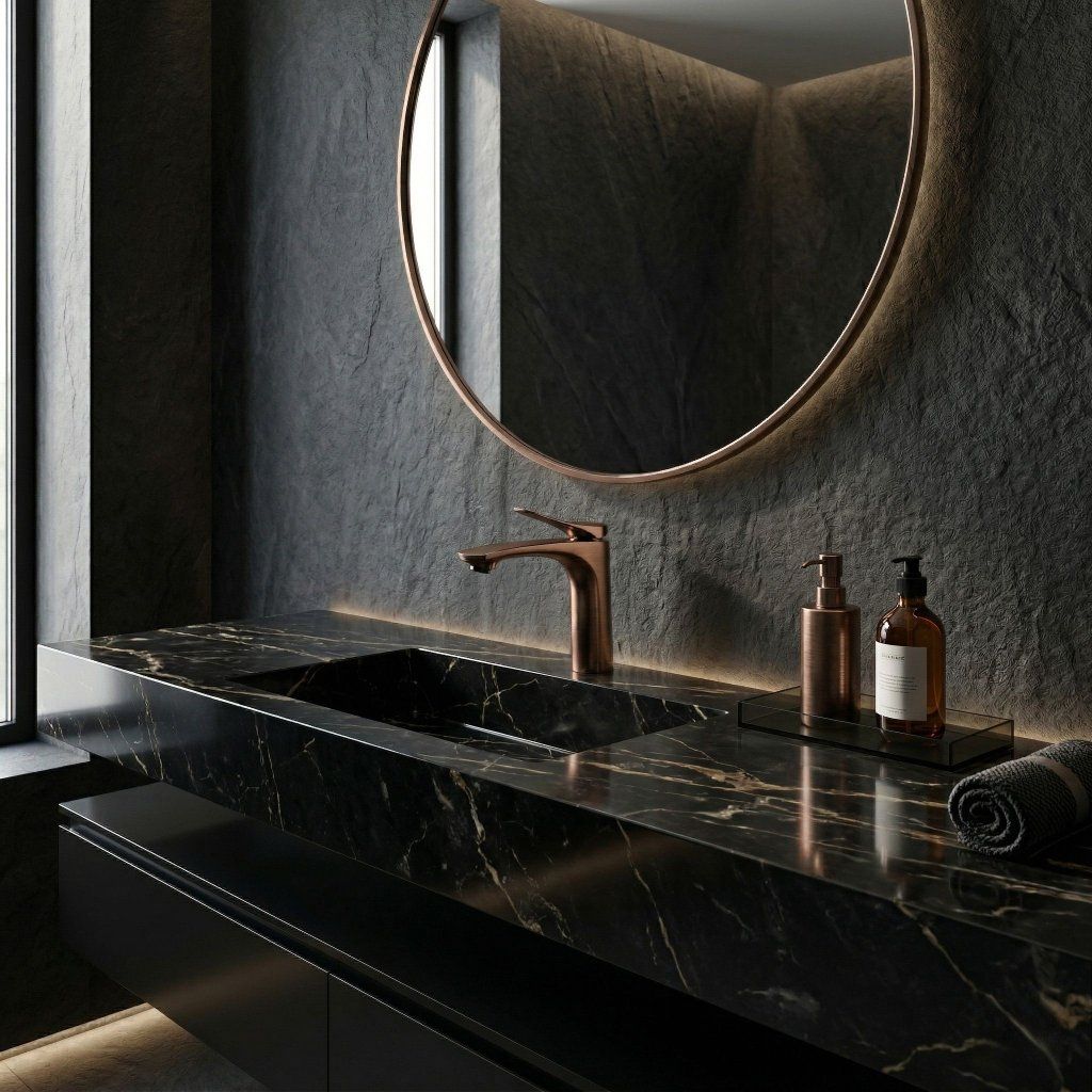 Egy betonnal, téglaburkolattal és nyers fémmel tarkított ipari fürdőszobában a szálcsiszolt réz a környezet hiteles anyaga – nem dekoráció, hanem a tér karakterének része. Egy modern, tiszta vonalakkal rendelkező belső térben meleg, emberi ellenpontként működik a hideg geometriával szemben.